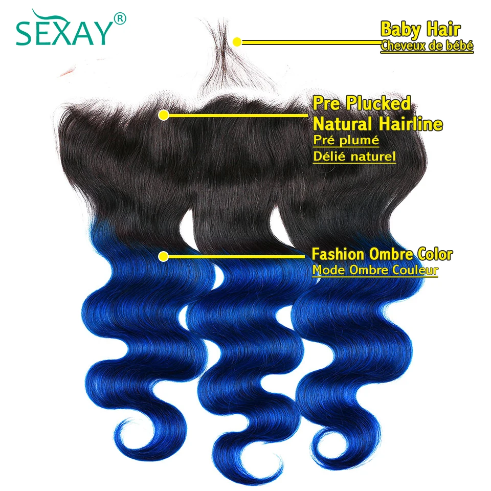 Sexay синие волнистые пряди с фронтальным Remy перуанские человеческие волосы для наращивания 28 дюймов 1B синие Омбре пряди с фронтальным