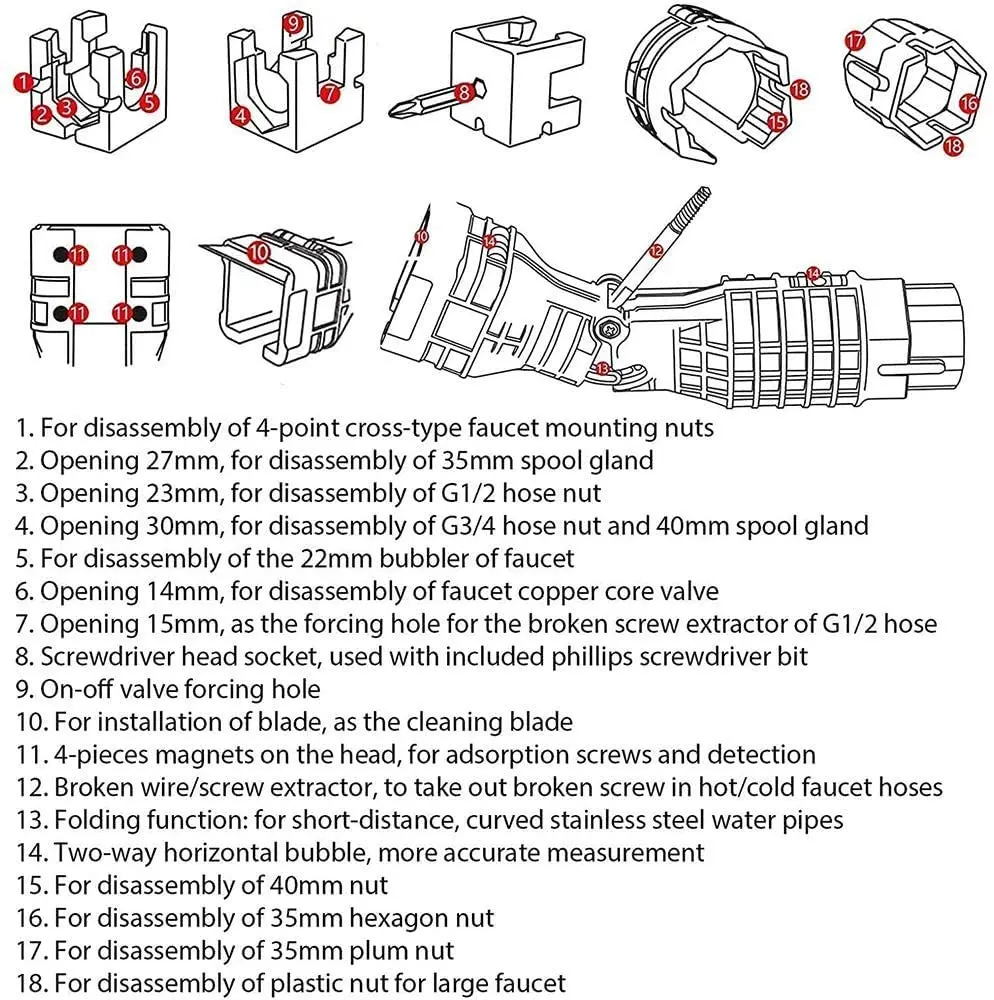 1. Гаечный ключ Flume подходит для подачи орехов, сетчатых Корзин, гаек для подачи, гаек для смесителя. Открытый слот обеспечивает легкий доступ к существующим линиям подачи, таким как краны, раковина, трубы водонагревателя, водные бассейны и так далее.
