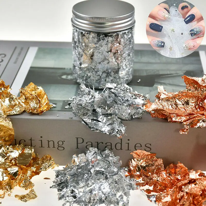 С золотыми, серебряными и медными цветами, хлопья из золотой фольги не легко выцветают и окисляются, они могут создать потрясающий Блестящий текстурированный эффект, чтобы ваши поделки выглядели особенными.