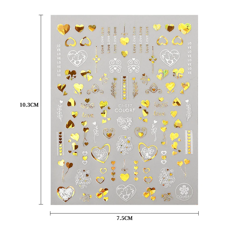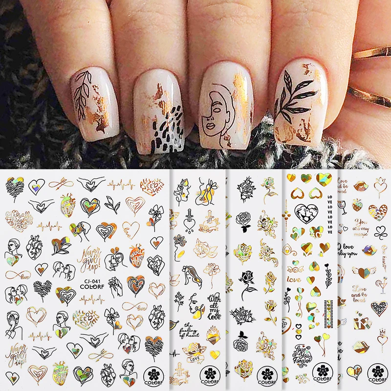 3D наклейки для ногтей в виде сердца, любви, Дня Святого Валентина, золотой фольгированный слайдер для ногтей, голографические бабочки, цветы, листья, украшения для творчества и ногтевого дизайна