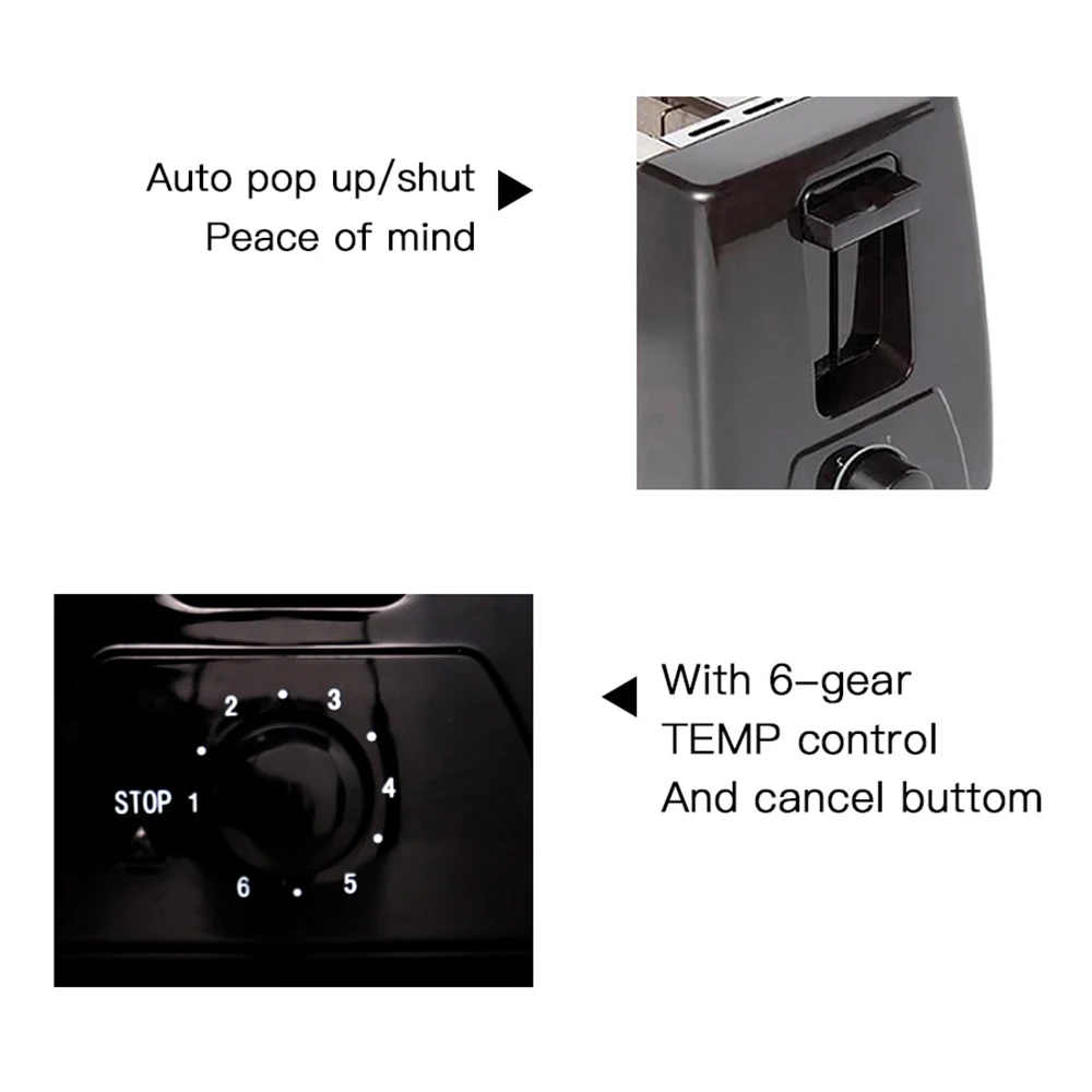 Цвет: черныйНапряжение: 220 ВМатериал корпуса: нержавеющая сталь + пластикНоминальная мощность: 750 ВтРазмеры: 21,5*11,5*16Зубчатая передача: 6 зубчатых передачОсобенности:◆Премиум материалы и 22 нижние вентиляционные отверстия, термостойкие, безопасные и долговечные в использовании.◆ 7 уровней регулируемого нагрева, который может топить хлеб, который вы желаете.◆Подходит для различных типов хлеба, таких как хлеб из цельной пшеницы, белый хлеб, замороженные вафли и т. д.◆ С этим эффективным тостером с 2 ломтиками Вы сможете одновременно насладиться вкусным завтраком с семьей!◆ Широкий дизайн запекания, автоматическая функция po p-up.◆ Тостер с двумя слотами, который достаточно широк, чтобы готовить кексы, тосты или бублики, и устройство для поднятия тостов, что позволяет легко удалить хлеб без сжигания пальцев