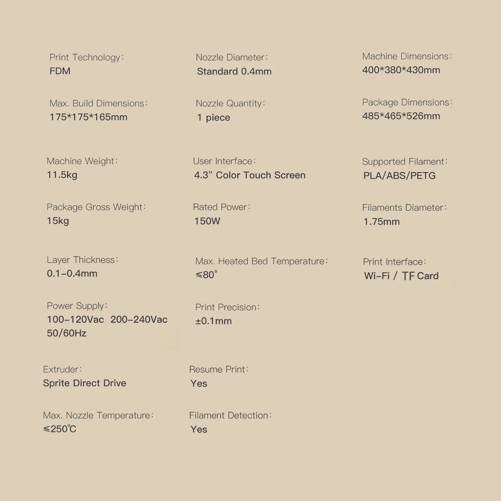 Особенности: Наружная печать-начните печать после получения машины, нет необходимости в сборке или выравнивании. Поставляется с нитью PLA 200g, вы можете попробовать напечатать немедленно.Полностью закрытая печатная машина и Удаленная печать-полностью закрытое шасси безопасно и стабильно, и бесплатно использовать приложение Creality Cloud для удаленной работы и печати, дизайн с многогранными прозрачными окнами, которые удобно просматривать в любое время. 175x175x165 мм пространство для печати Симпатичная модель.Одна клавиша для подачи и вывода нити накаливания-только одна клавиша для управления катушкой нити для входа и выхода, очень дружелюбная для начинающих.Super Silence Operation-оснащен четырехосным бесшумным IC драйвер материнской платы, а также ультра-тихим вентилятором, внутренняя работа составляет всего 45 дБ, а работа и отдых не нарушаются.Съемная поверхность здания и сопло-металлическая мягкая магнитная наклейка на платформе, сильная Магнитная Адсорбция, легко приклеивается к модели и легко снимается.Характеристики: Модель: Sermoon V1Размер модели: 175x175x165 ммТехнология моделирования: FDMКоличество насадок: 1Сопло Диаметр: 0,4 мм (Стандартный)Точность: ± 0,1 ммПечатные материалы: 1,75 мм PLA / ABS / PETGПоддерживаемые форматы нарезки: STL / OBJ / AMFРазмер машины: 400x380x430 ммНоминальная мощность: 150 ВтТемпература горячей кровати: ≤ 80 ℃Температура сопла: ≤ 250 ℃Температура окружающей среды: 10 ℃ - 30 ℃Восстановление потери энергии: ДаОбнаружение нити: ДаПоддерживаемое программное обеспечение для нарезки: слайсер Creality, Repetier-Host, Cura, Simplify3dЛокально способы печати: tf-карта или облачная печать через Wi-FiМощность: 100-120vac 200-240vac 50/60hzОперационные системы: Windows XP / Vista/ 7 / 10/ Mac / LinuxСкорость печати: ≤ 150 мм/сек., обычно от 30 до 60 ммРазмер посылка: 48,5x46,5x52,6 см/19,1x18,3x20,7 дюймаПосылка, вес: 15 кгУпаковочный лист: 1 x набор Sermoon V1