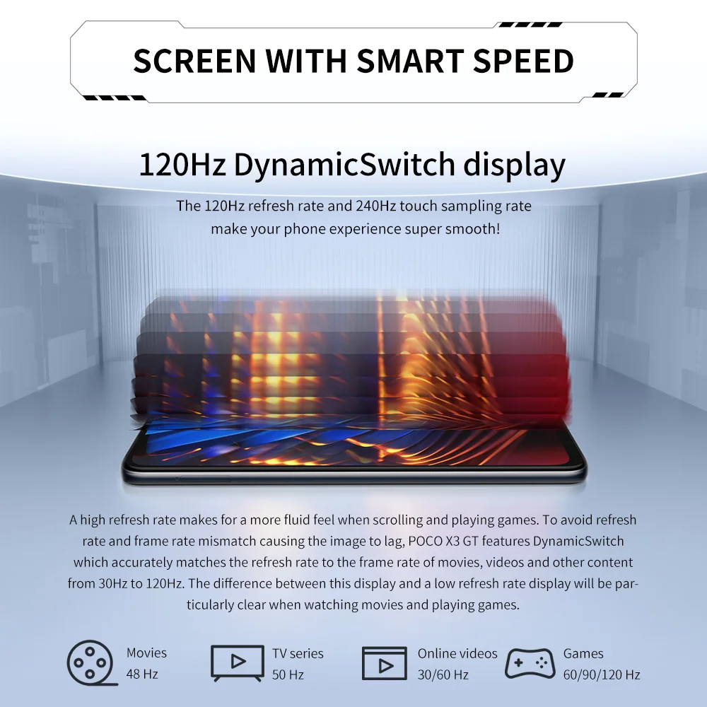 Высокая частота обновления обеспечивает более плавное ощущение при прокручивании и воспроизведении игр. Чтобы избежать несоответствия частоты обновления и частоты кадров, что приводит к задержке изображения, POCO X3 GT оснащен динамическим переключателем, который точно соответствует частоте обновления к частоте кадров фильмов, видео и другое содержимое от 30 Гц до 120 Гц. Разница между этим дисплеем и низкочастотным дисплеем будет особенно ясна при просмотре фильмов и воспроизведении игр