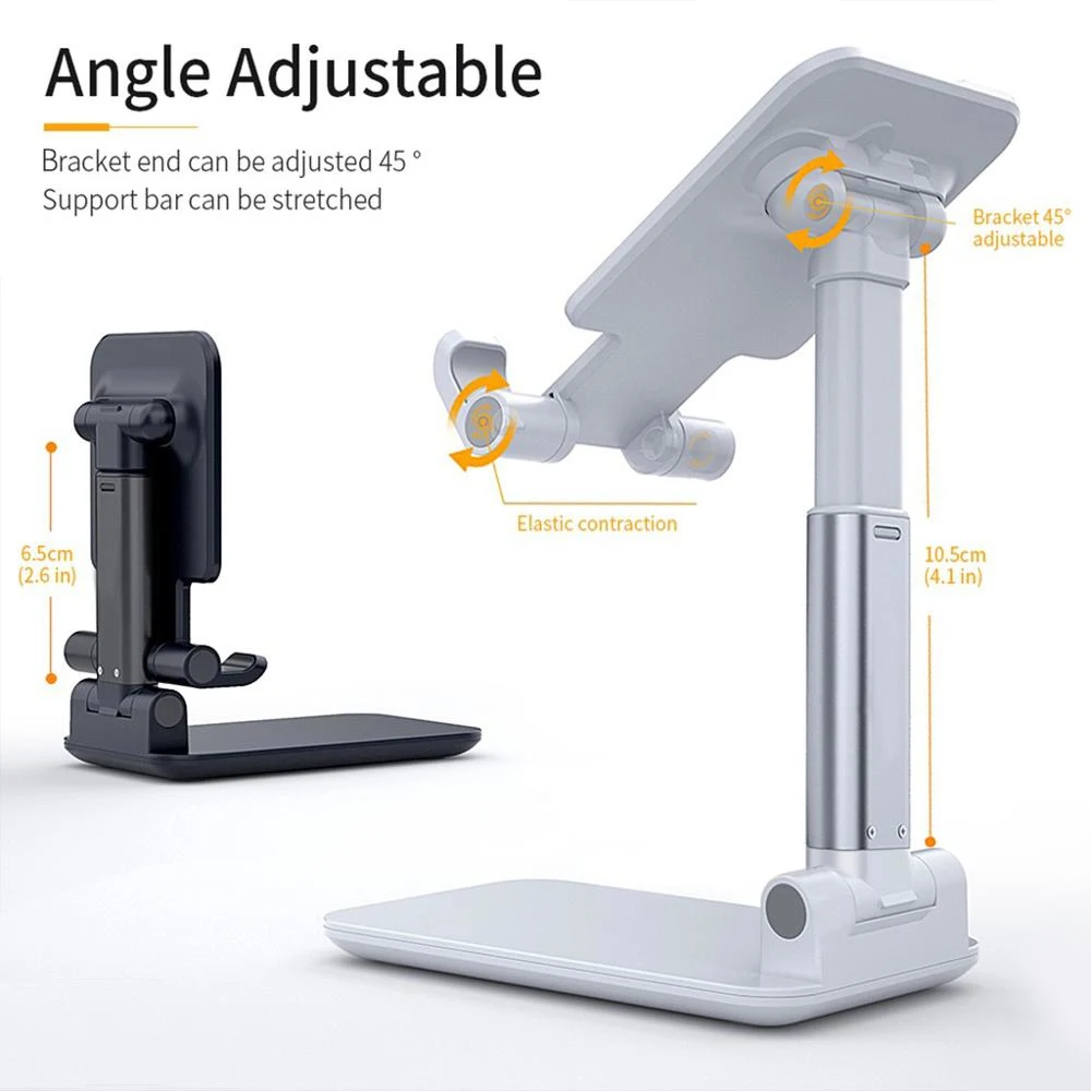 Спецификация продукта 1. Название: складной мобильный телефон Подставка для планшета 2. Размер: 105*110 мм 3. Вес 4. Диапазон регулировки угла: 90 °-135 ° 5. Диапазон регулировки высоты: 650 мм-105 мм 6. Цвет: белый, черный 7. Материал: PC/ABS + основание из алюминиевого сплава внутри 8. Стиль: складной; Регулируемый; Удобный; Мини