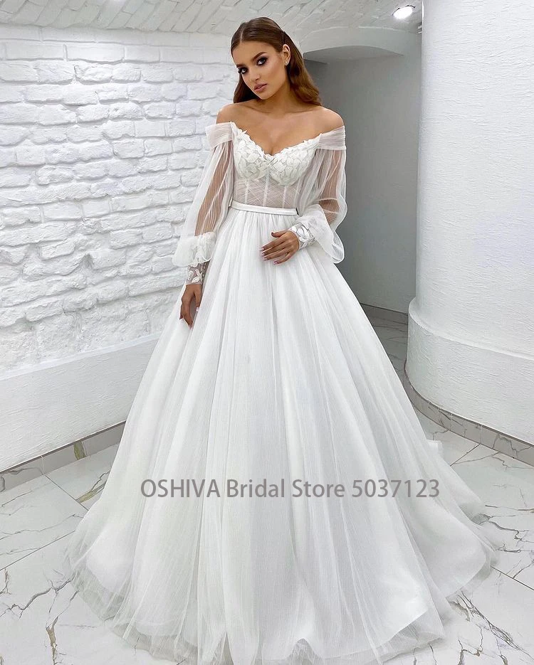 Шикарные Свадебные платья с длинным рукавом, кружевные с аппликацией, с открытыми плечами, с рюшами, тюль, трапециевидный строгий Фотофон
