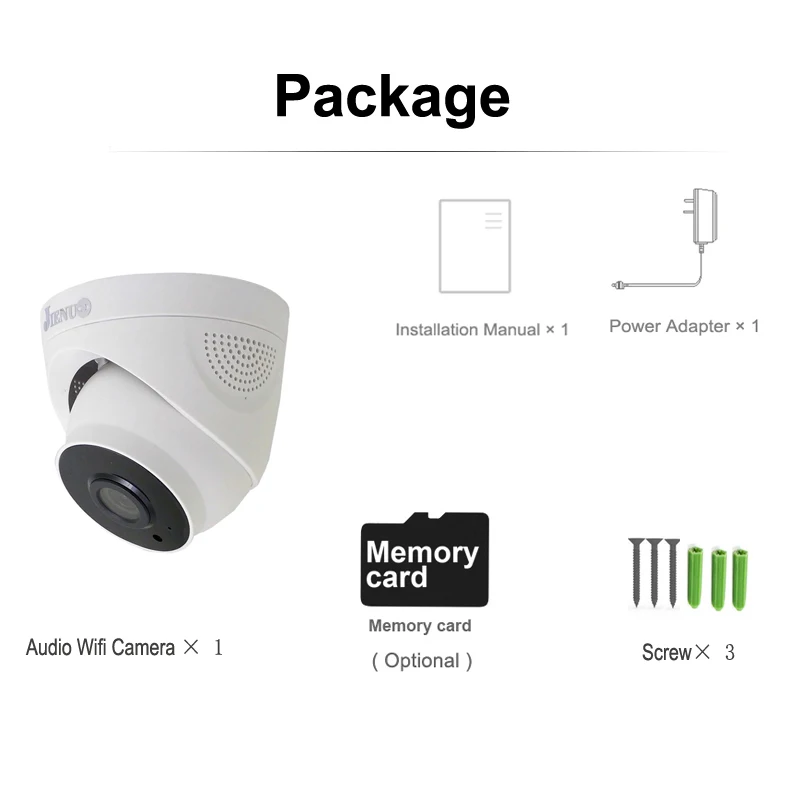 WIFI камера * 1 + адаптер питания * 1 + винтовая упаковка * 1 + руководство пользователя на английском языке * 1 + карта памяти (опционально)