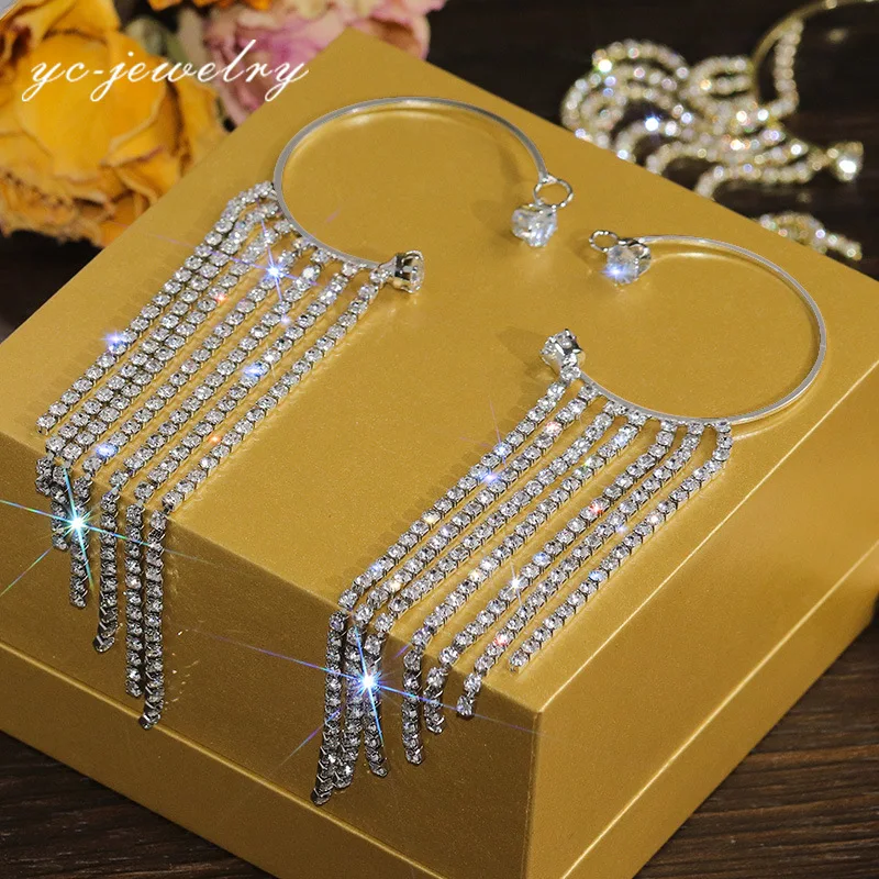 Модные длинные блестящие серьги-клипсы Стразы с кисточками из цирко...