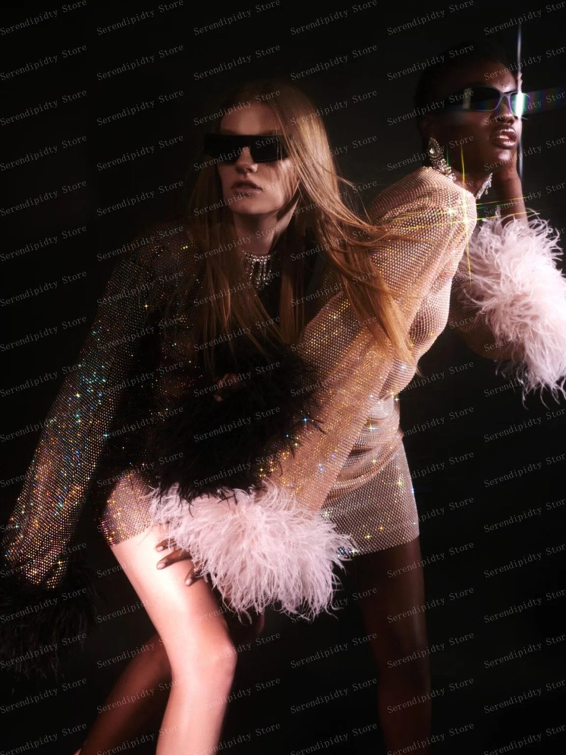 Прозрачное розовое платье, мини-платье с перьями и блестками, элегантные платья для женщин, вечернее платье, платья знаменитостей