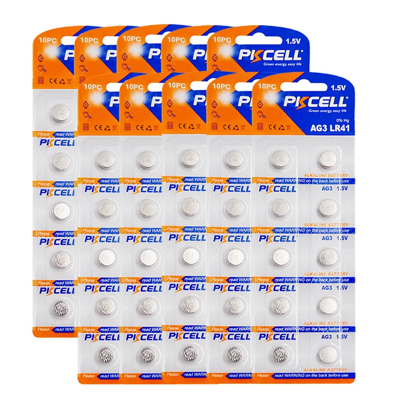 100 шт.10 карт, кнопочные батареи PKCELL AG3 1,5 в 30 мАч, LR41 AG3, аккумулятор для часов SR41W 392 192 192A LR736 для термометров