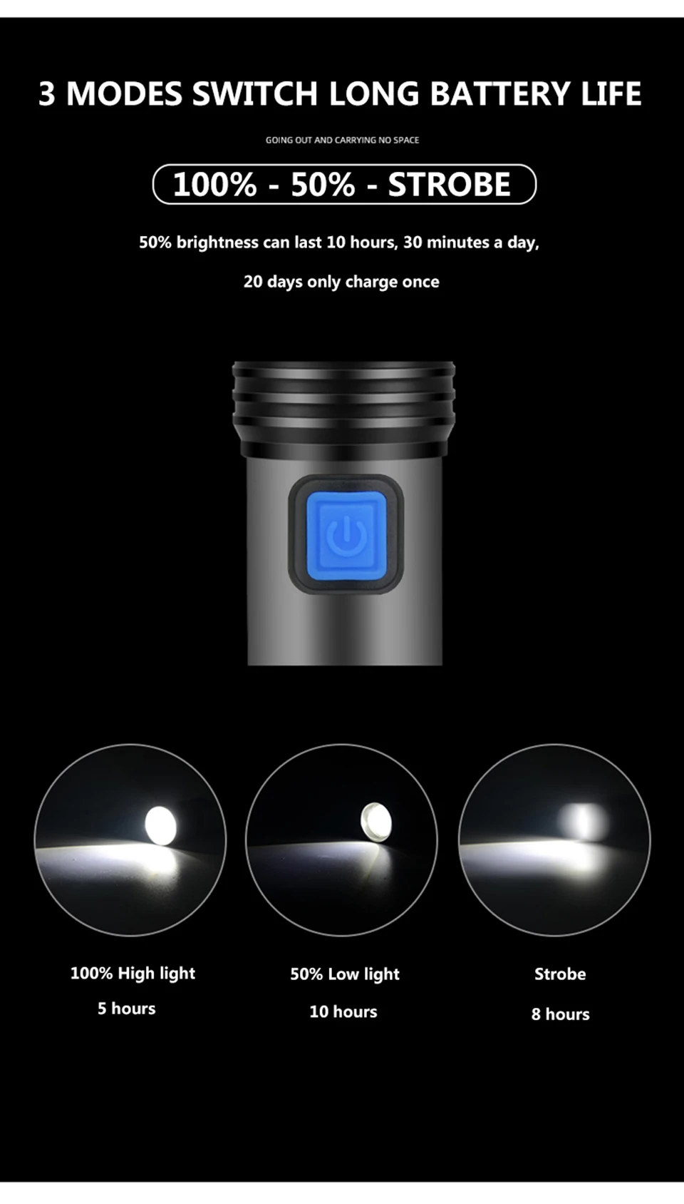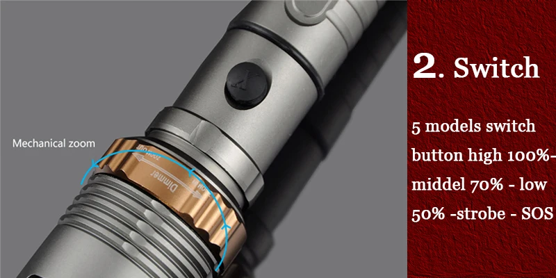 Уличный фонарь высокой интенсивности A100 с 5 уровнями яркости. Задний переключатель контролирует все функции. Или выключение или цикл 5 моделей. Начните с "High → Mid (70%)→ Low(50%)→ strobe→ sos; Strobe Momentary в течение 2 секунд. Светодиодный фонарик XM-L T6 отличается потрясающей яркостью и длительным бросанием. Светильник для активного отдыха, кемпинга, пеших прогулок, поиска собак, рыбалки, езды на велосипеде, альпинизма, заполняющий светильник для барбекю, охоты и т. Д.