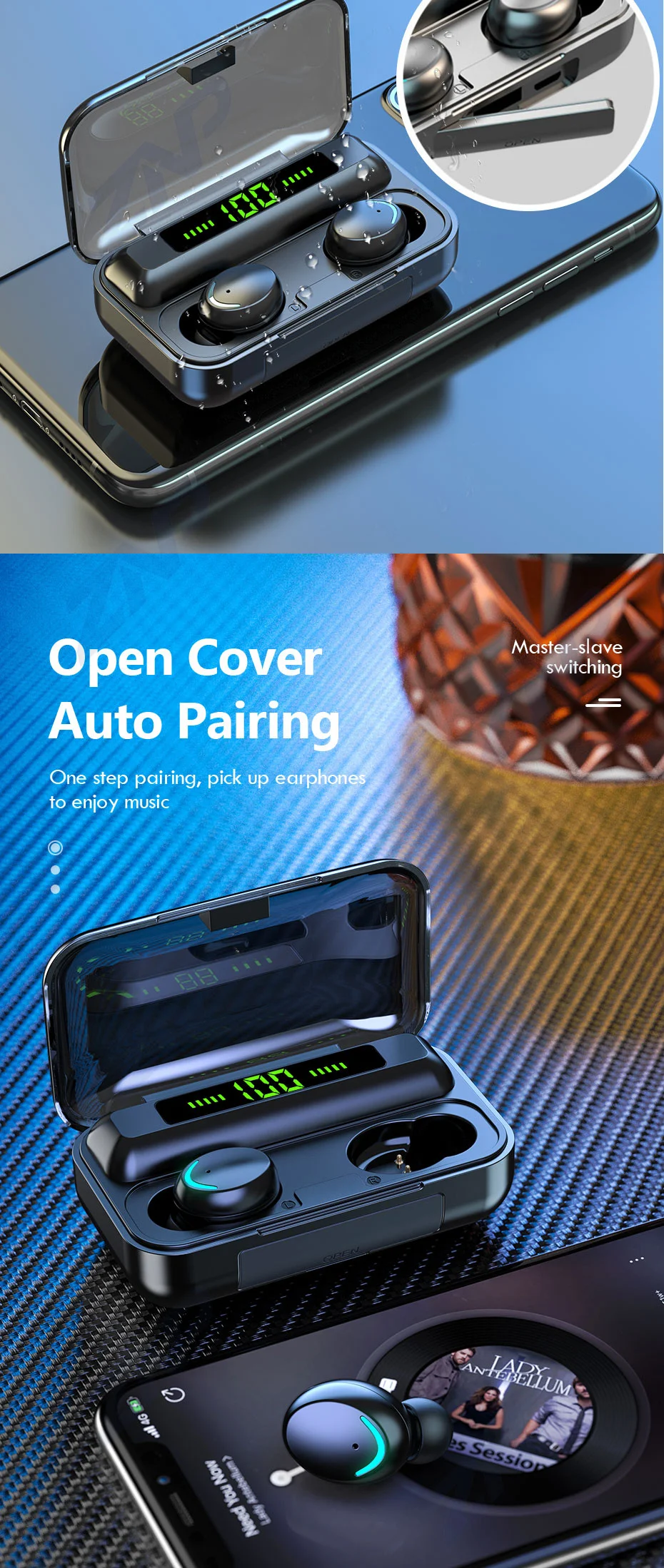 Feature 2IPX5 Waterproof + 2200mAh Charging Case