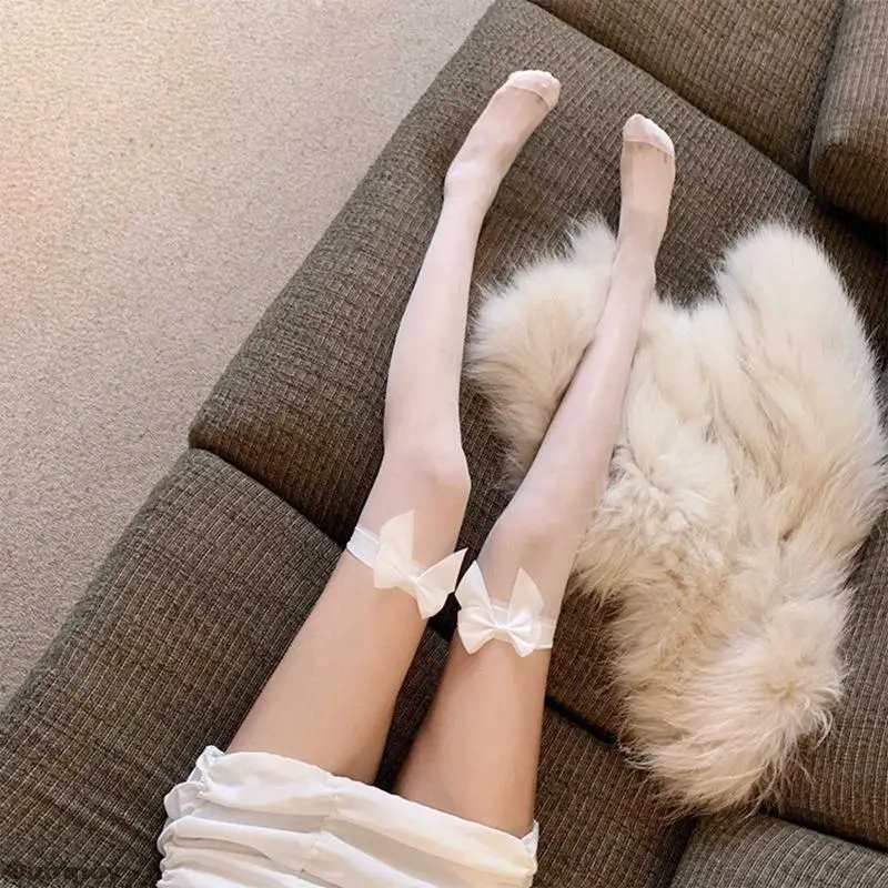 Чулки Женские выше колена, соблазнительные ультратонкие кружевные Гольфы с бантом для девушек, черные белые