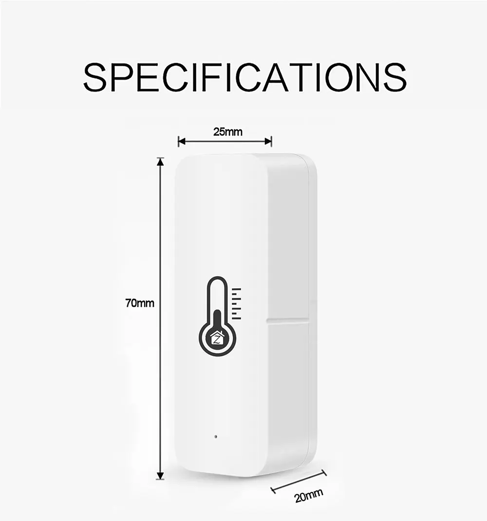 Название продукта: WiFi датчик температуры и влажностиТип батареи: 2 * AA (не входит в комплект)Ток покоя: ≤ 30uAНизкое напряжение и пониженного напряжения: ≤ 2,7 VБеспроводной протокол: 2,4 ГГцРабочая температура:-10 ℃ ~ + 50 ℃Рабочая влажность: 10%-90% относительной влажностиПриложение: приложение Smart Life/приложение TuyaРаботает с: Alexa и Google home