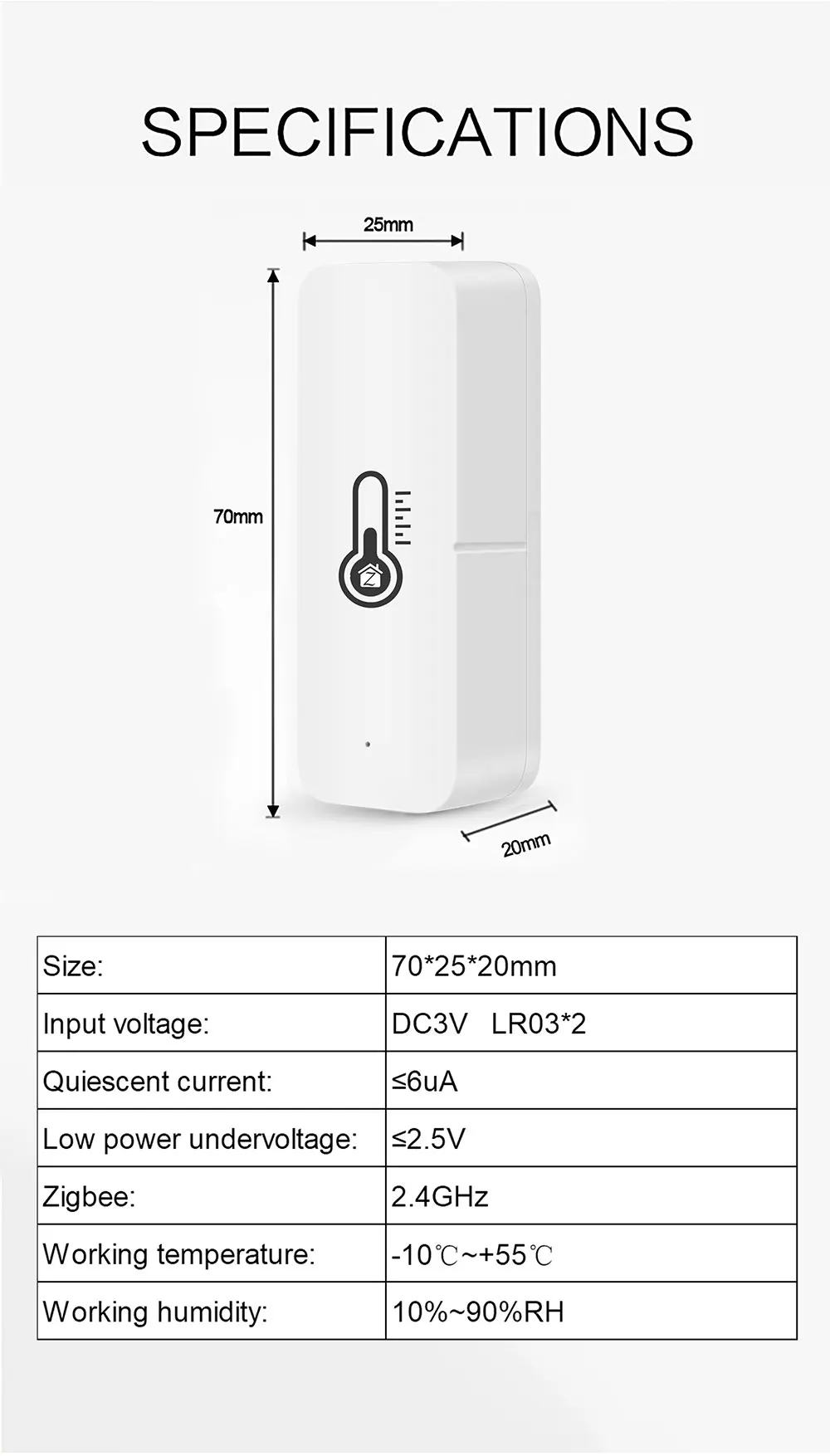Название продукта: датчик температуры и влажностиТип батареи: 2 * AA (не входит в комплект)Ток покоя: ≤ 30uAНизкое напряжение и пониженного напряжения: ≤ 2,7 VБеспроводной протокол: Zigbee 3,0Рабочая частота zigbee: 2,400 ГГц-2,484 ГГцРабочая температура:-10 ℃ ~ + 50 ℃Рабочая влажность: 10%-90% относительной влажностиПриложение: приложение Smart Life/приложение TuyaРаботает с: Alexa и Google home