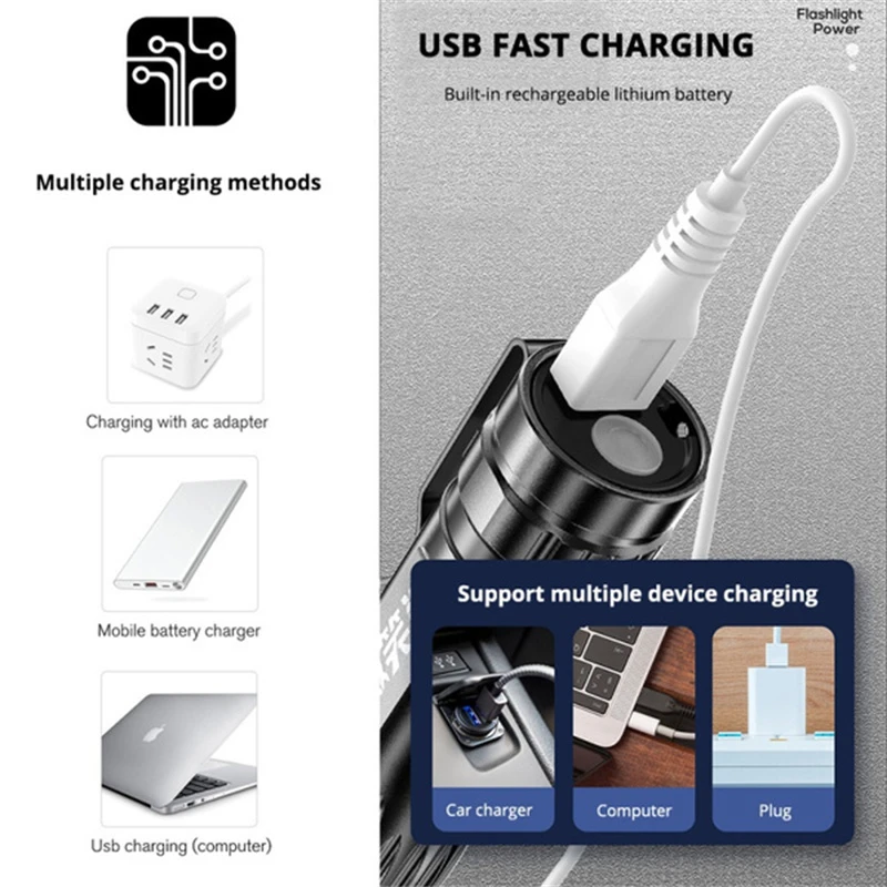 1. G3 лампы высокой яркости/Встроенный аккумулятор большой емкости/легко носить с собой/IPX6 Водонепроницаемый/анти-падение и анти-падение;2. Специальный Подгонянный светильник, более сфокусированный;3. Индивидуальный фитиль G3, более яркий и энергосберегающий;4. Матовая текстура удобна в хранении, имеет высокопрочную структуру и устойчива к падению и срезу;5. Умная быстрая зарядка, с помощью интерфейса USB для зарядки Android, более удобная и быстрая;6.14500 аккумулятор большой емкости;