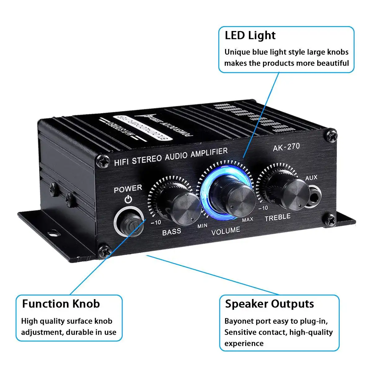 Особенности:-Мини HIFI аудио усилитель мощности.-Корпус из алюминиевого сплава, толстый, приятный на ощупь.-Большой Ручки спроектированы с синий светодиодный свет для того, чтобы сделать продукты более красивым.-Низкое Искажение обеспечивает более четкий, сильный и мощный звук.-Два выхода основного канала, выходы левого и правого каналов являются интерфейсами для динамиков.-Поддержка входного сигнала AUX.