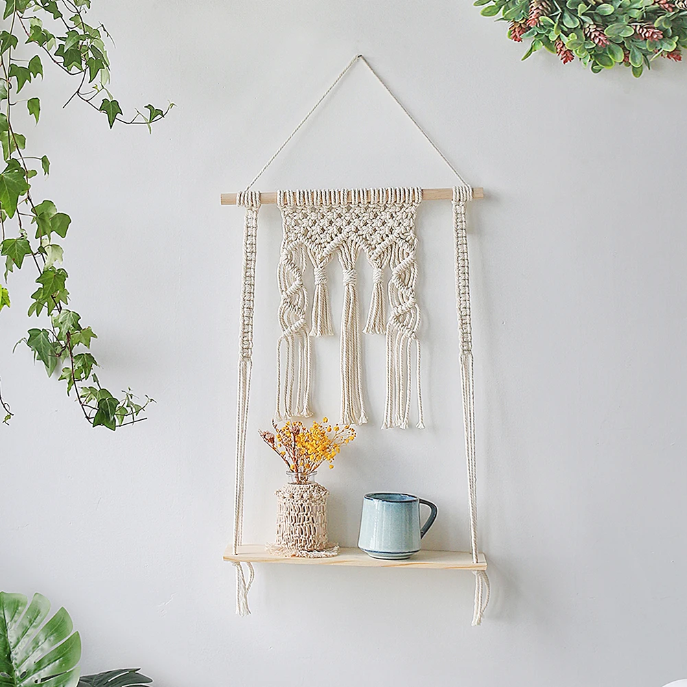 Макраме настенная подвесная полка-бохо Настенный декор подвесная растительная полка-Тканое дерево плавающее полка для маленьких растений, фоторамки для гостиной, спальни, ванной комнаты, домашнего декора