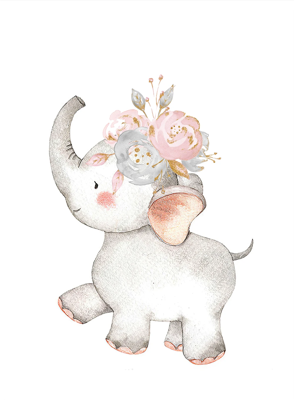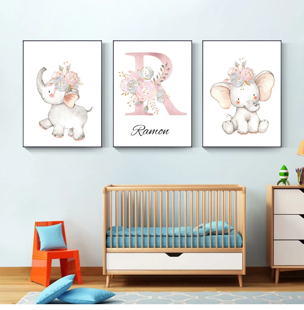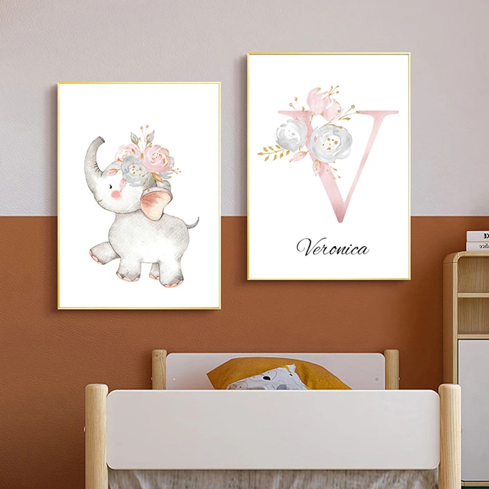 Детская живопись на холсте с именем на заказ, художественный печатный плакат, Настенная картина, персонализированный розовый слон, Цветочная буква, украшение для спальни и девочки