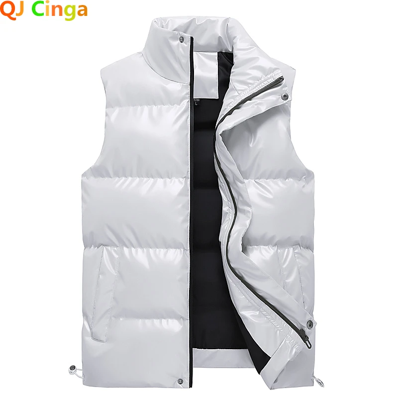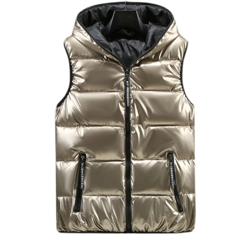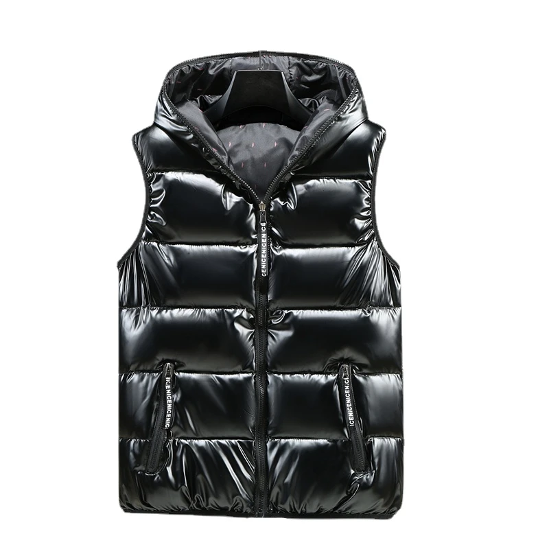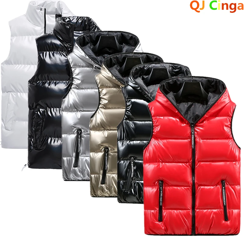 Мужскойженский жилет, зимняя Глянцевая парка с капюшоном, жилет, повседневный жилет, мужская куртка без рукавов, теплые пальто, шапка, Новинка