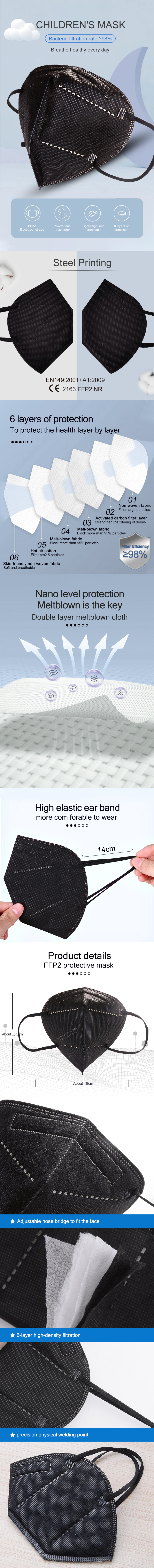 Регулируемый зажим для носа, удобный в использовании.Светильник с весовым дизайном, мягкий и удобный в носке и дышащий.Влагостойкий, нетоксичный, не раздражающий,95% фильтрации по крайней мере.Стандарт: FFP2 EN149:2001 + A1:2009