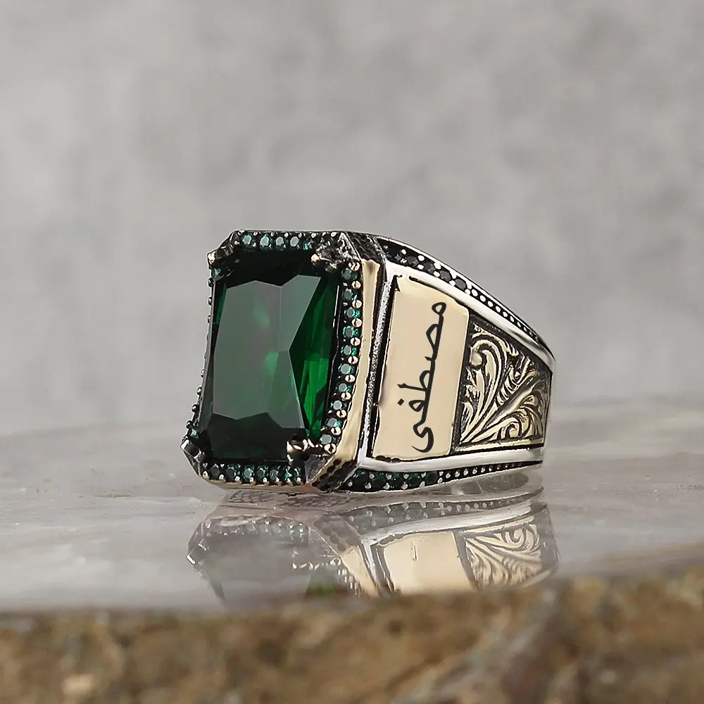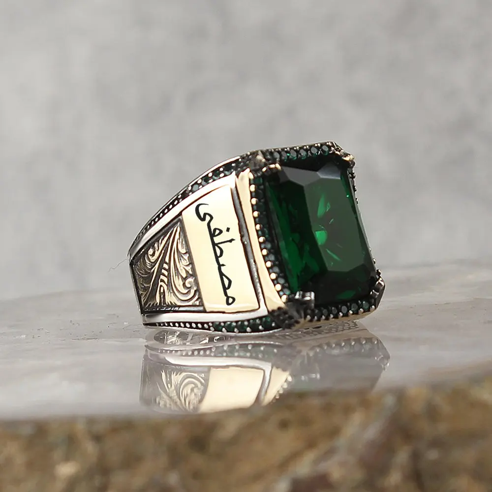 Мужское бриллиантовое серебряное кольцо, зеленый циркон, желаемое имя написано, является персонализированным мужским подарочным аксессуаром, Сделано в Турции
