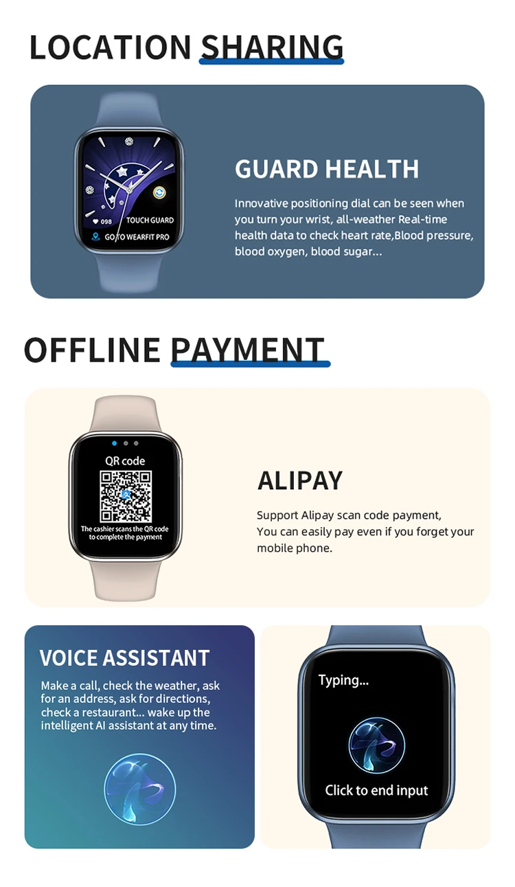 1. Следите за своим здоровьем:Пульс/кровяное давление/кислород в крови/глюкометр в крови, трекер сна, напоминание о малоподвижности.2. Хороший помощник для тренировки:Шаги, сожженные калории, расстояние, спортивный режим.3. Хороший помощник для повседневной жизни:BT телефонные звонки, синхронизация уведомлений, NFC (Touch and Go) для контроля доступа, блокировка экрана пароль, OTA обновления, Bluetooth музыка, дыхание упражнения, повышение до пробуждения, калькулятор, будильник, секундомер, пользовательские лица, найти мой браслет, погода, регулировка яркости, часы лица рынок, сплит-экран, 3D динамические лица и т. Д.