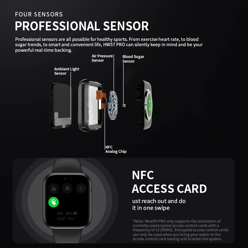 Новый HRS3300 датчик имеет низкую потребеление энергии, более точные данные, 24-часовое испытание самоуправляемая мониторинга и заботится о вашем здоровье круглосуточно.HW57 PRO Оснащен 4-х ядерный оптический оксиметр датчик, позволяя вам измерить вашу оксиметр уровня в тех случаях, когда вам это нужно, и просматривать результаты измерений в течение дня.Революционный Инновационный Датчик, оснащенный новым умным алгоритмом wearfit pro app, отслеживает тренд глюкозы в крови пользователей круглосуточно, обмен данными в реальном времени и защищает здоровье.