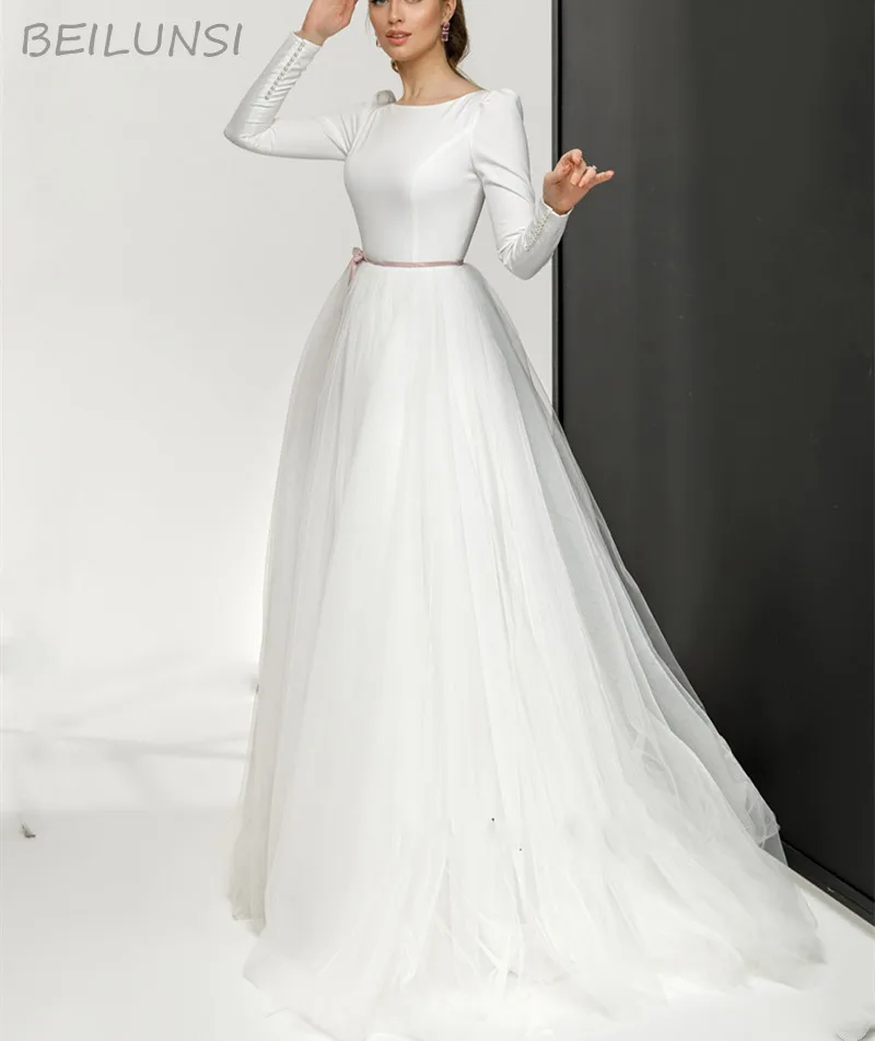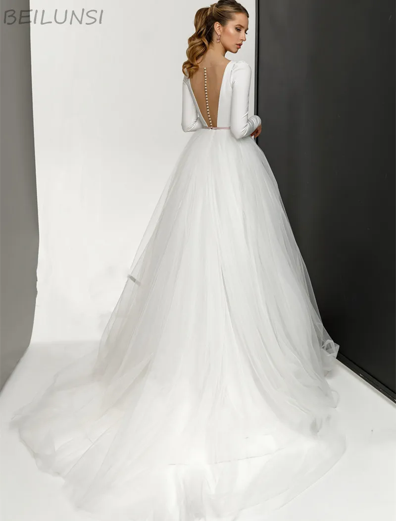 Винтажные свадебные платья, простые тюлевые свадебные платья 2022, а-силуэт, Глубокий круглый вырез, длинный рукав, низкая цена, платье невесты с открытой спиной для невесты