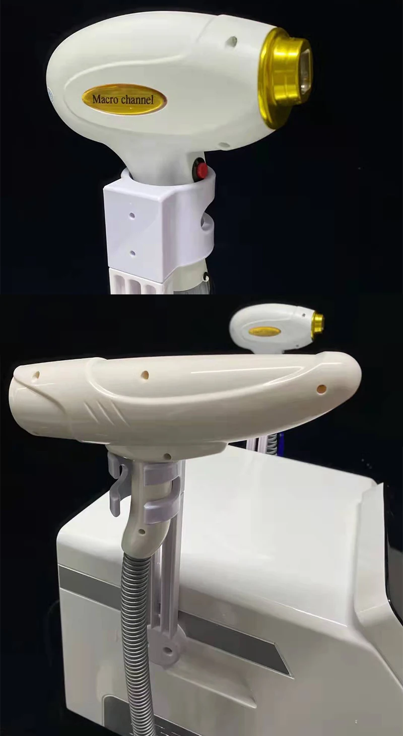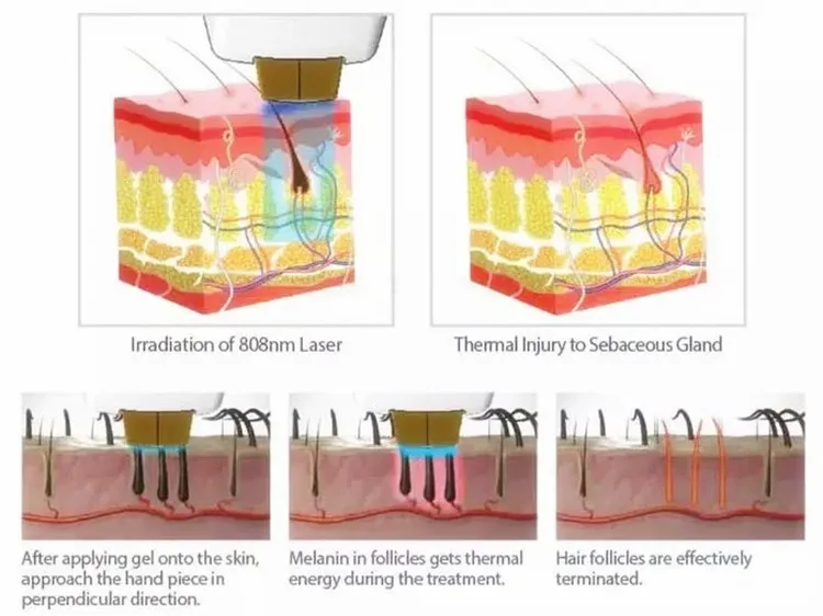 Диодный лазерный прибор использует длину волны 808nm, которая имеет специальную эффективность для меланоцитов волосяного фолликула без каких-либо повреждений окружающих тканей. Лазер может быть поглощен меланоцитами волосяного вала и волосяных фолликул и преобразован в тепло для повышения температуры волосяного фолликула. Когда температура поднимается до определенного уровня, который может необратимо разрушить структуру волосяного фолликула, структура волосяного фолликула исчезнет после естественного физиологического процесса волосяного фолликула, тем самым достигая цели для постоянного удаления волос.