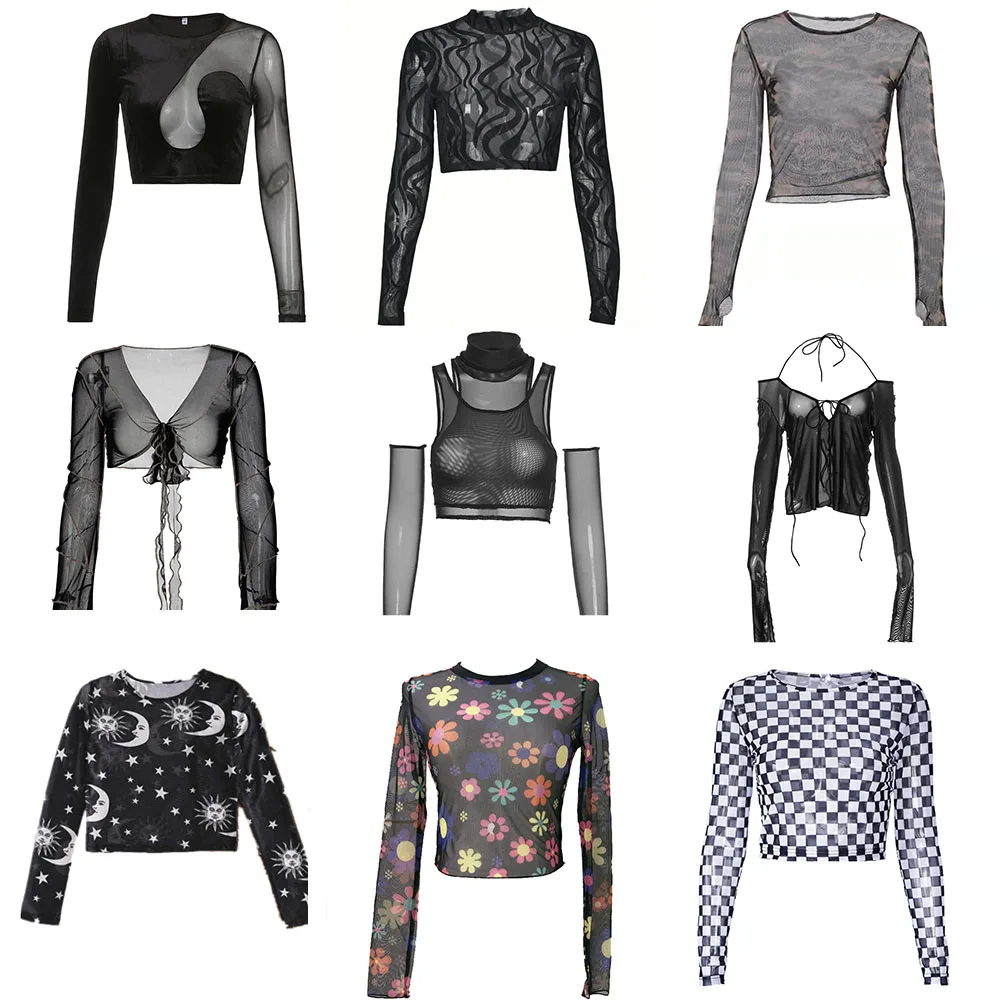 Женские сексуальные сетчатые Топы Harajuku с длинным рукавом, Прозр...