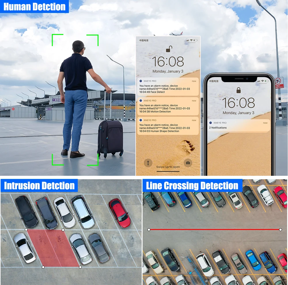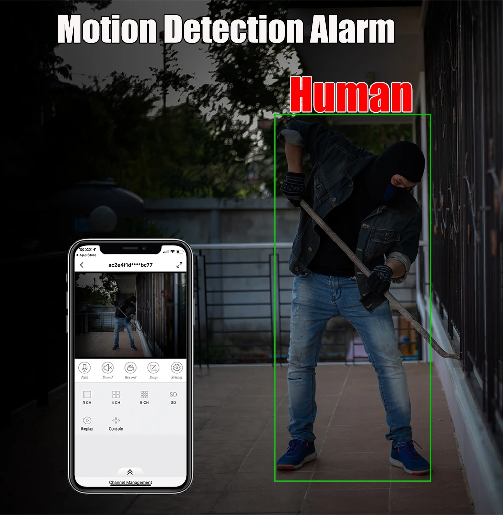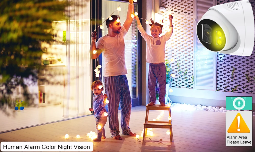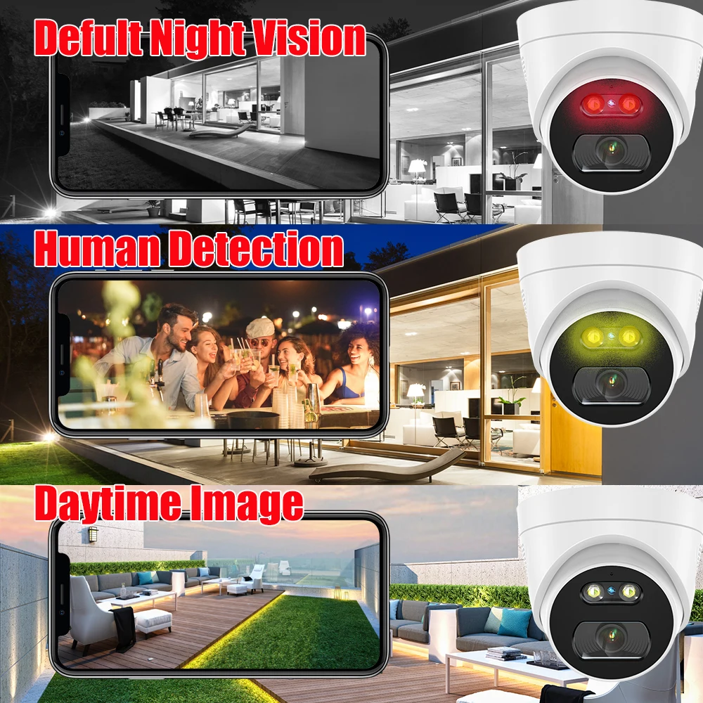 Гуманоидное оповещениеDefult будет черно-белым ночным видениемКогда человек входит в зону камеры, светодиодный индикатор будет белым, а изображение камеры будет иметь цвет.