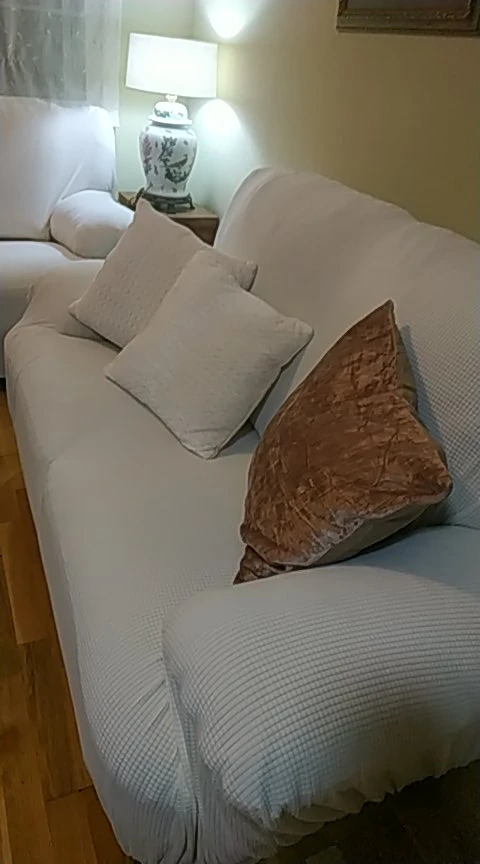 Заказываю уже второй раз такой чехол, нравится менять интерьер дома и цветовые решения, не покупая при этом новый диван) цвет бежевый немного желтит, хотелось более холодный оттенок, но ничего, тоже неплохо) в комплекте был мешочек для хранения чехла, и поролоновые держатели. Плюс положили подарок - брелок. По таблице размеров продавца заказала на 4местный (от 215см) так как мой диван 230см, но в итоге с одной стороны дивана немного висит лишняя ткань (на фото указала), нестрашно, тк диван как раз той стороной прижат к стене, но если бы было иначе, пришлось бы подшивать, хотя размер должен соответствовать. Тем не менее 5 звезд) чехол супер!
