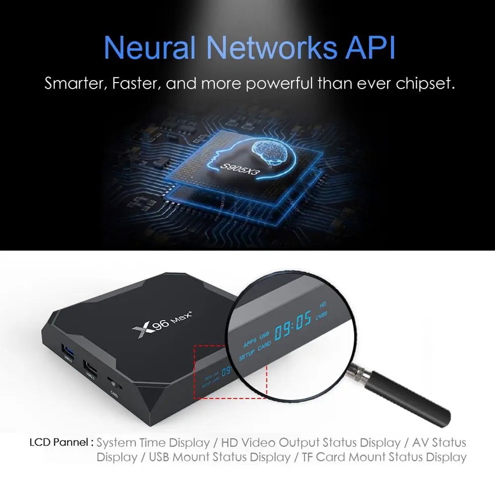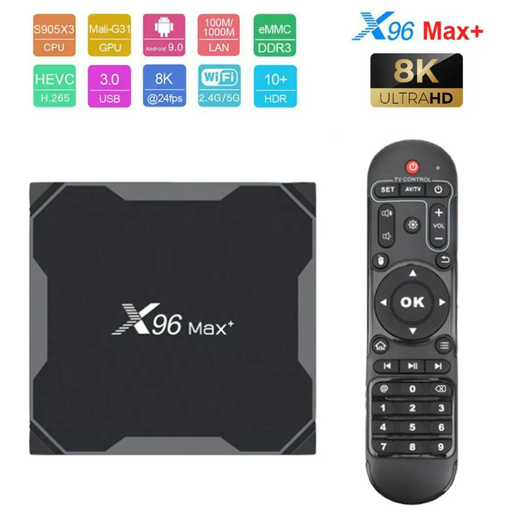 Последний ТВ-бокс в 2021, поддерживает разрешение 8/4K, наслаждайтесь суперчеткими изображениями и захватывающим эффектом просмотра.Технология декодирования H.265 экономит половину полосы пропускания, чем H.264, поэтому она может показать яркие и насыщенные детали изображения.4 ГБ Оперативная память и 32/64/128 ГБ Встроенная память, большая емкость позволяет загружать больше приложений и игр в вашем ТВ коробка.Четырехъядерный процессор Amlogic S905X3 предназначен для плавной и гибкой работы, не беспокойтесь о проблеме медленной работы.Последняя Система Android 9,0 с открытым исходным кодом, вы можете наслаждаться всем, что вам нравится.Поддержка версии HDMI 2,1, удобно передавать фотографии, видео на экран телевизора.2,4G/5,8G dual WIFI и bluetooth 4,1 подключение обеспечивает более стабильный беспроводной сигнал для вас, чтобы наслаждаться HD медиа и играть в игры.Поддержка s мыши и клавиатуры через usb-порт; Также поддержка 2,4 ГГц беспроводной мыши и клавиатуры через 2,4G USB ключ.Многоразовые сцены: офисная работа, Домашние развлечения, демонстрация встреч, школьное образование, цифровая реклама и т. д.Характеристики:-Процессор: Amlogic S905X3 64-разрядный четырехъядерный процессор ARM®Cortex A55-GPU: G31 MP2-ОС Android 9,0-ОЗУ/ПЗУ: 2 ГБ/16 ГБ, 4 ГБ/32 ГБ, 4 ГБ/64 ГБ-Поддержка HD: 8K x 4k @ 24fps, 4K x 2k @ 30fps, UHD, HDR +, Airplay, Miracast-Поддержка HD 2,1, USB3.0, USB2.0-Поддержка 2,4 GHz Wifi/2,4G + 5,8 GHz Dual Wifi, BT4.1-Голосовая воздушная мышь может включить ТВ-бокс (если вы покупаете голосовую воздушную мышь и ТВ-приставка от нас).-Поддержка обновления прошивки онлайн-Поддерживает несколько защищенных сеансов декодирования видео и одновременное декодирование и кодирование-Декодирование видео/изображений-Профиль VP9-2 до 8K x 4K 24 fps-H.265 HEVC MP-10 L5.1 до 8K x 4K 24 fps-AVS2-P2 профиль до 8K x 4K 24 fps-H.264 AVC HP L5.1 до 4K x 2K 30fps-MPEG-4 ASP L5 до 1080P 60fps (ISO-14496)-WMV/VC-1 SP/MP/AP до 1080P 60fps-AVS-P16(AVS +) /AVS-P2 JiZhun профиль до 1080P 60fps-MPEG-2 MP/HL до 1080P 60fps (ISO-13818)-MPEG-1 MP/HL до 1080 60fps (ISO-11172)-RealVideo 8/9/10 до 1080P 60fps-Поддержка нескольких языков и нескольких форматов-MJPEG и JPEG неограниченное разрешение пикселей декодирование (ISO/IEC-10918)-Поддержка JPEG thumbnail, масштабирование, вращение и эффекты перехода-Поддерживает *. МкВ, *.wmv,*.mpg, *.mpeg, *.dat, *.avi, *.mov, *.iso, *.mp4, *.rm и *. Форматы файлов jpgПосылка товара:1 x X96 Max Plus Android TV Box1 x адаптер питания (DC 5V/2A)1 х HDMI кабель1 пульт дистанционного управленияРуководство пользователя (на английском языке)-1 шт.Есть 3 варианта для X96Max +:2 ГБ + 16 Гб: 2,4G Wifi4 Гб + 32 Гб: 2,4G & Wi-Fi 5 ГГц двухъядерный процессор Wi-Fi + BT4.14 Гб + 64 Гб: 2,4G & Wi-Fi 5 ГГц двухъядерный процессор Wi-Fi + BT4.1