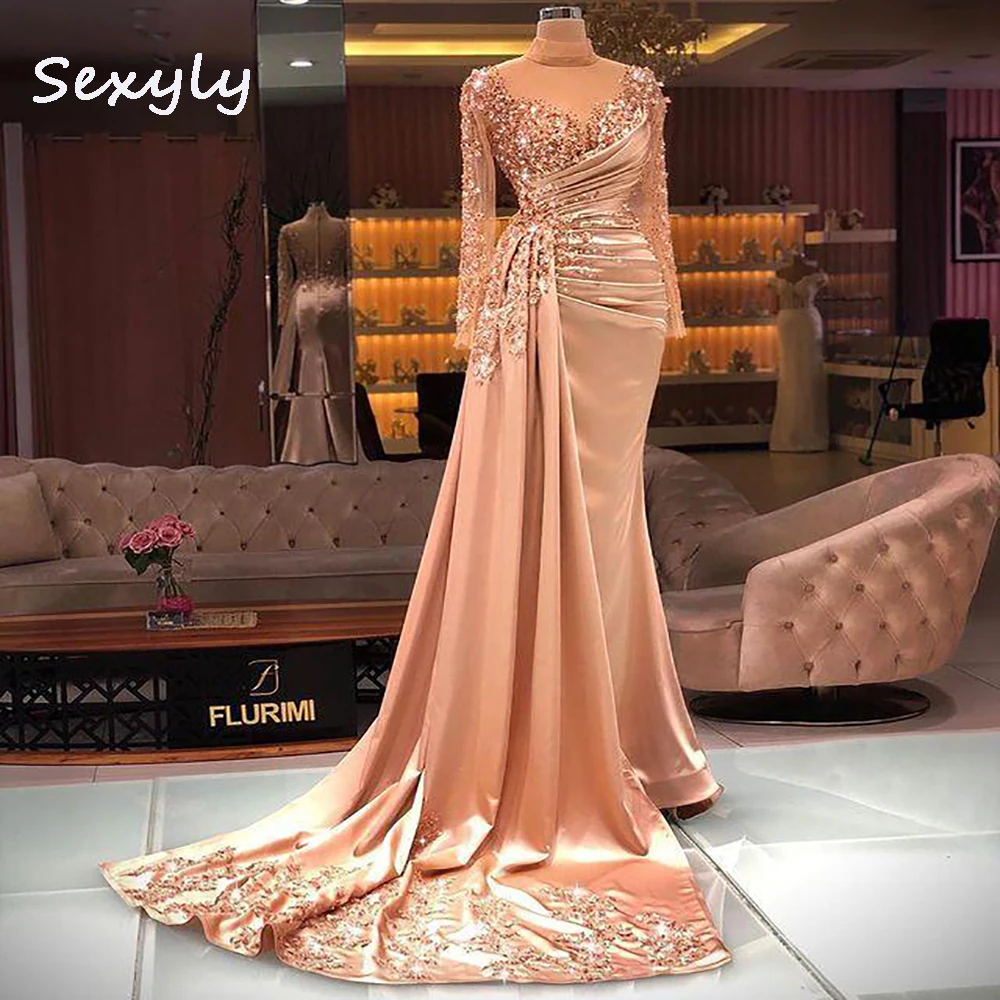 Арабское Золотое вечернее платье Дубая со шлейфом, платье с длинным рукавом и юбкой-годе для выпускного вечера, 2022 шелковое атласное официальное платье для вечеринки