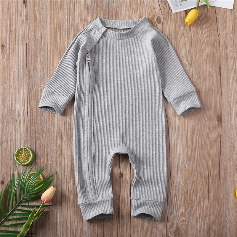 Однотонный Комбинезон для маленьких девочек и мальчиков, комбинезон в рубчик на молнии и пуговицах с длинным рукавом, однотонные комбинезоны с круглым вырезом
