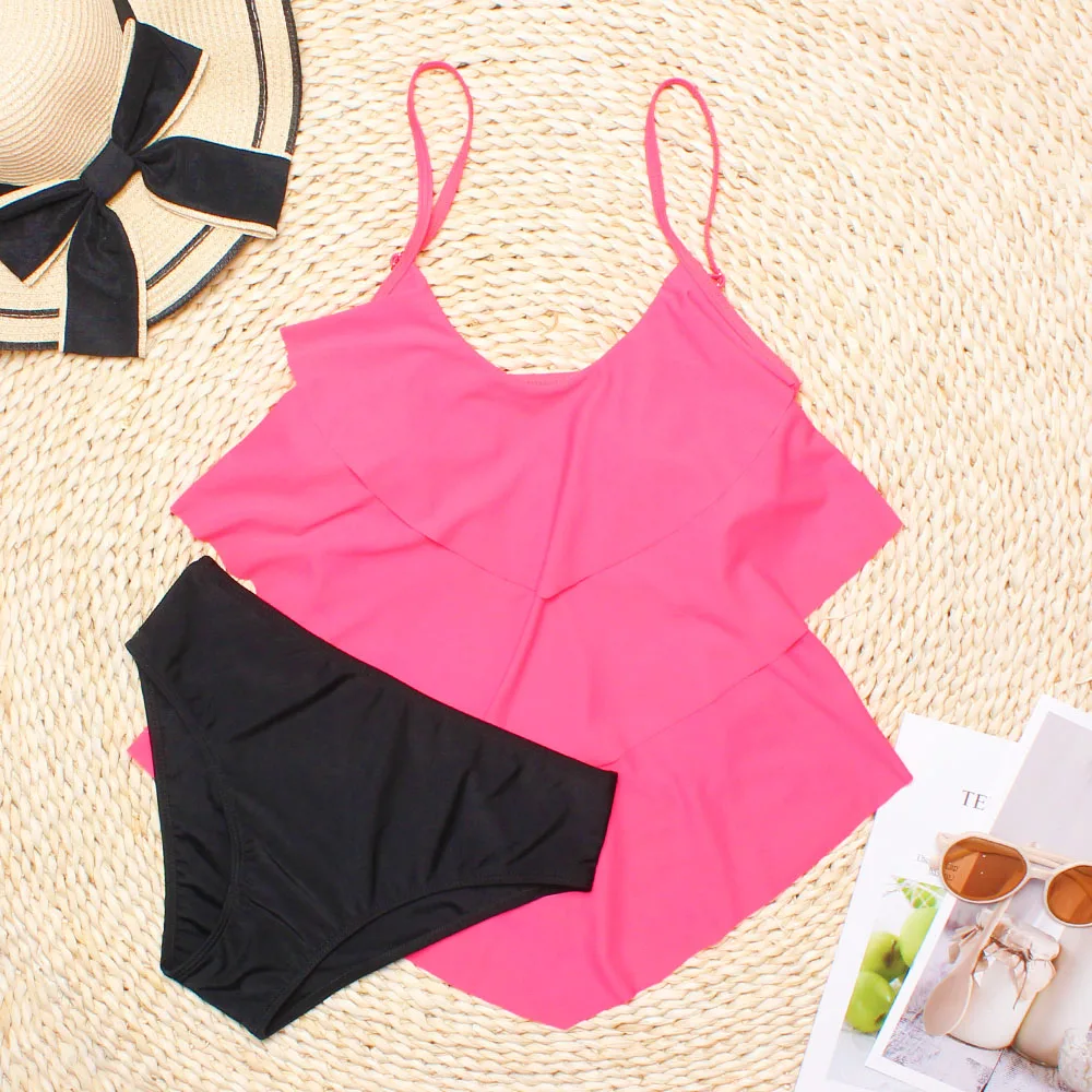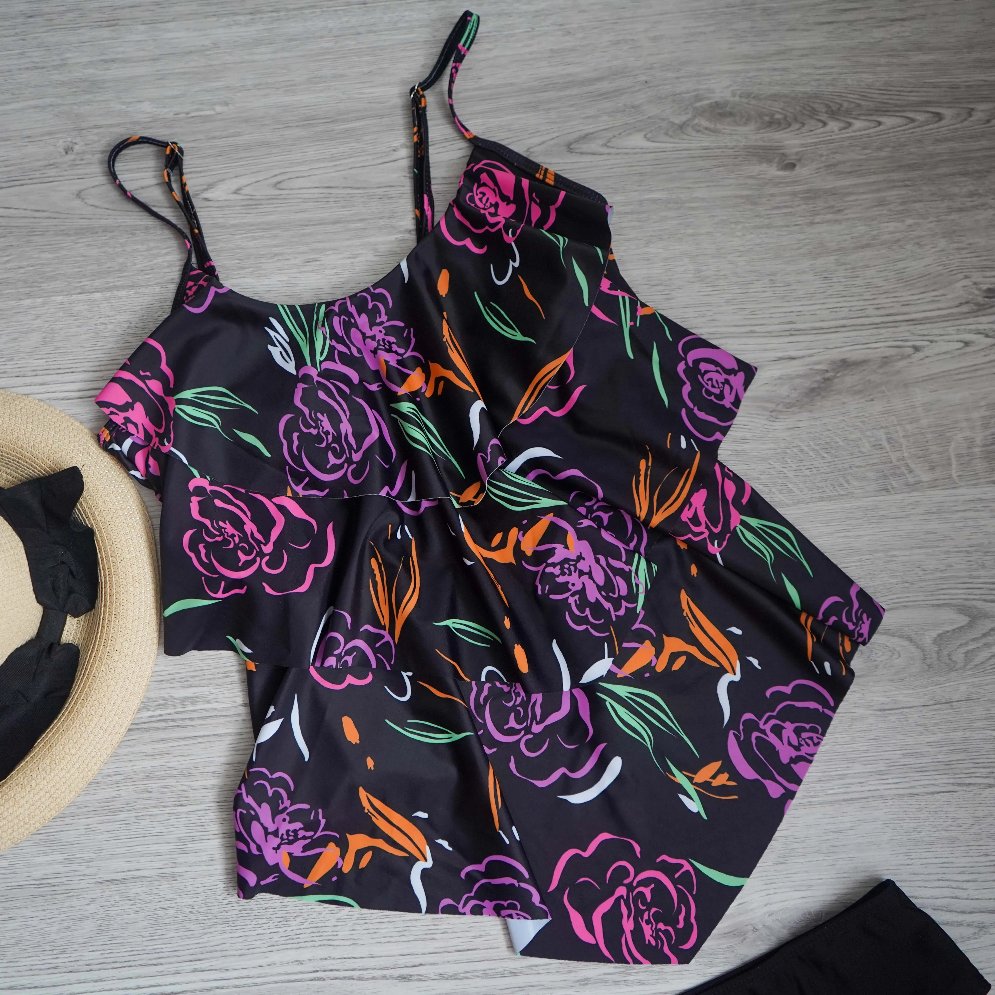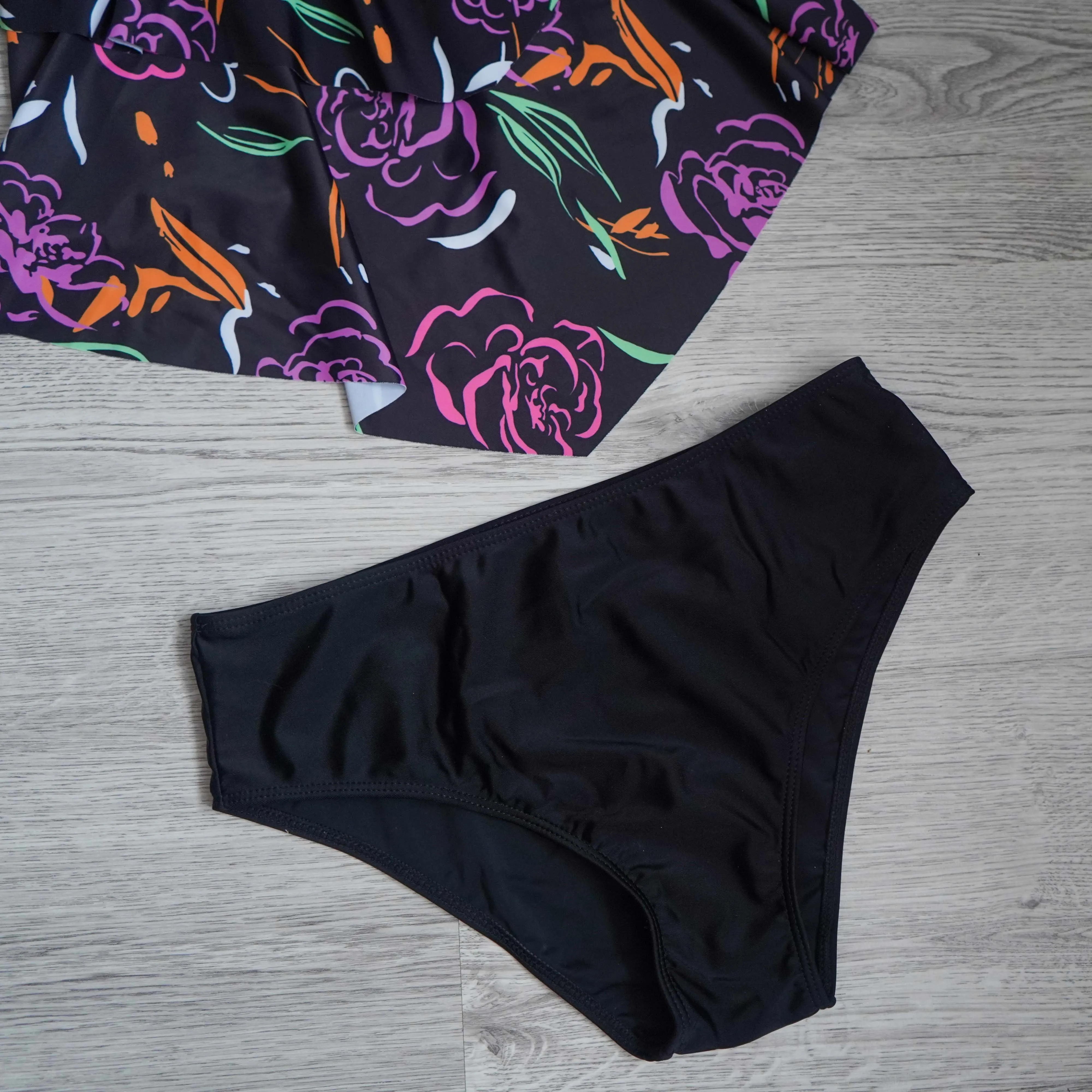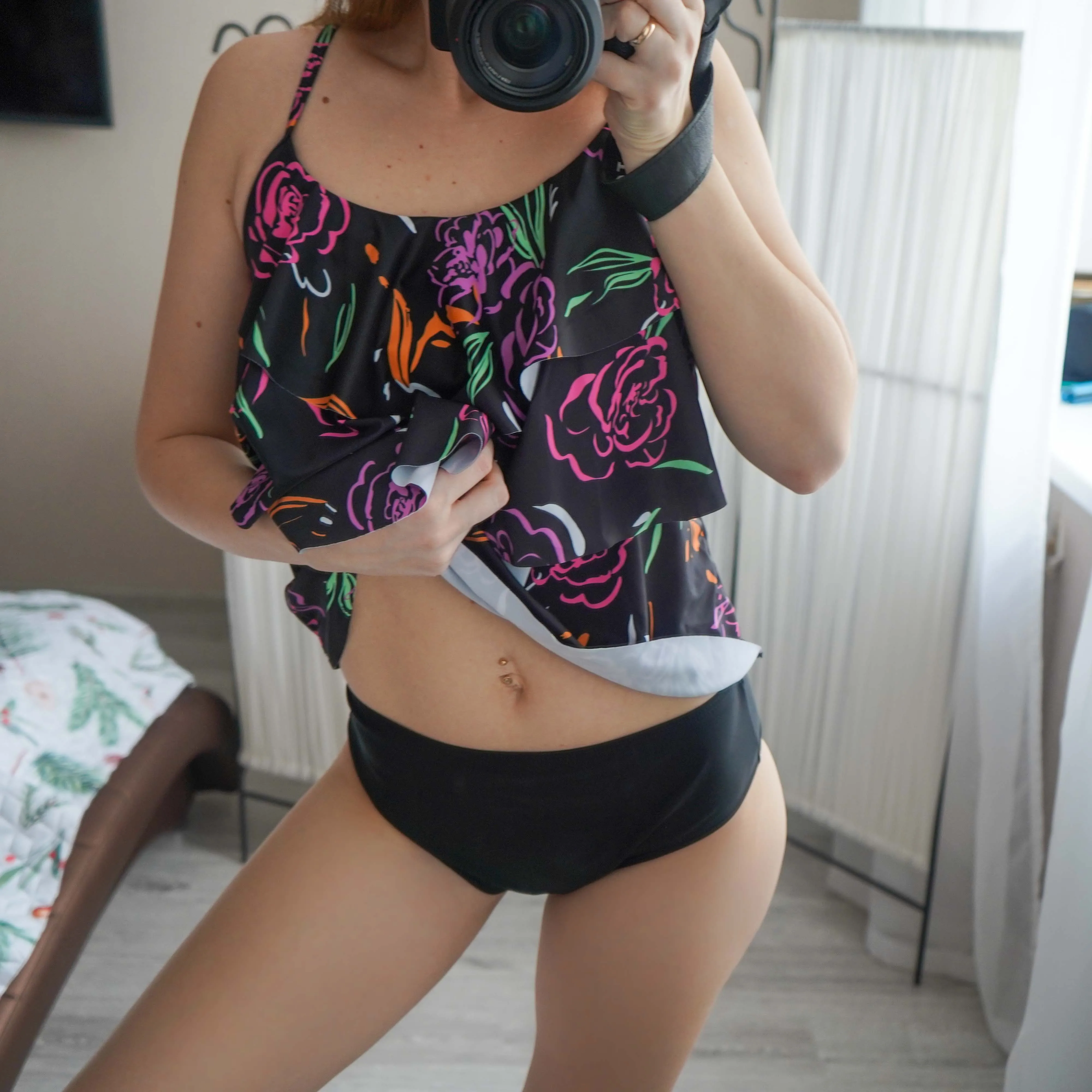 Оригинальный купальник. Состоит из топа и трусиков. На мне размер L. Топ украшен воланами. Бретельки можно регулировать по длине. Так же есть чашки. Сами трусики классической посадки. Понравилось качество пошива и сама ткань, она достаточно плотная, не просвечивает. Модель смотрится отлично, скрывает недостатки и несмотря на воланы, не делает фигуру объемной.