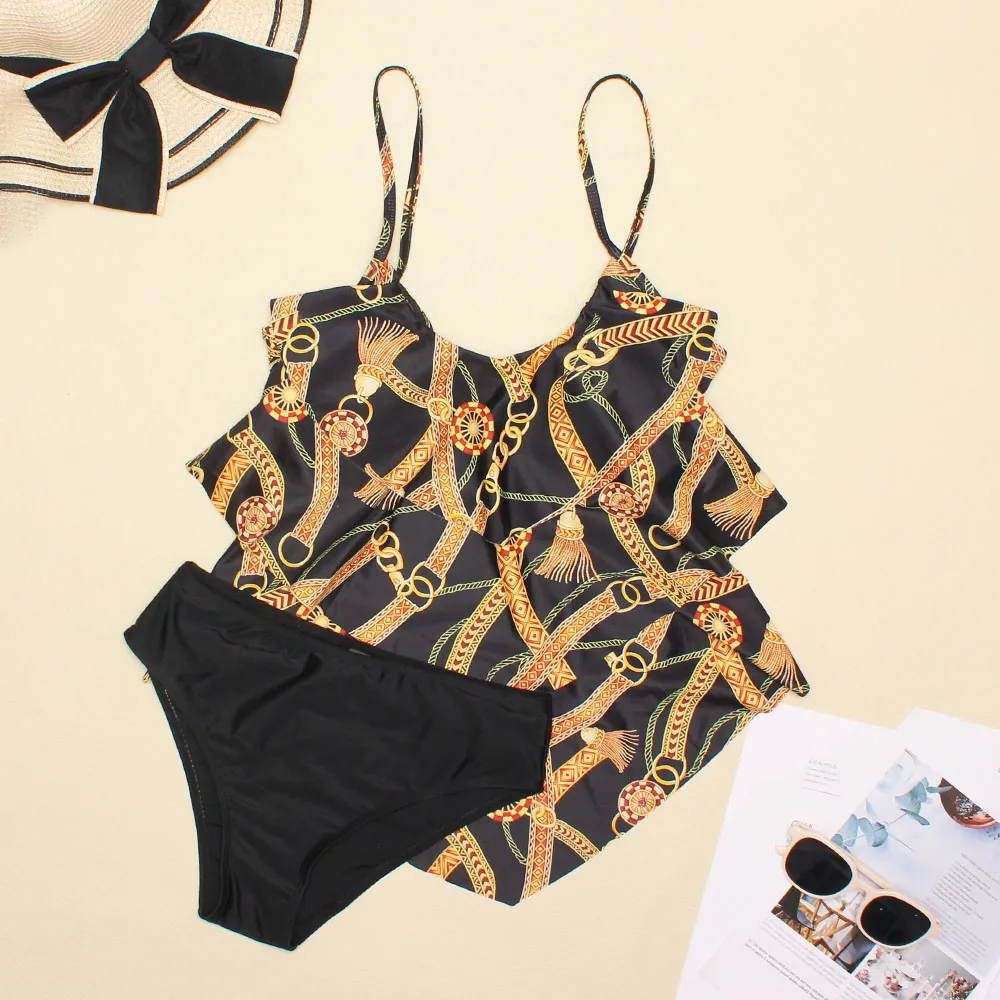 Женский купальник из двух предметов, пикантный пляжный купальный костюм с оборками и винтажным индийским принтом