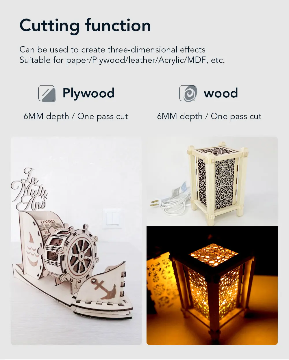 Наиболее профессиональные варианты гравировки и резки:И SF, и LF могут сделать гравировку и резку!Фокус SF лазера меньше, изображение тоньше, и он больше подходит для гравировки.LF имеет большую глубину поля с большей плотностью мощности. И больше подходит для резки.Максимальная толщина составляет 12 мм фанеры (оснащена LF соплом, поверхность резки гладкая и не будет черных краев).Покупатели только заказывают воздушный компрессор самостоятельно для LU2-4 LF лазерной формы.