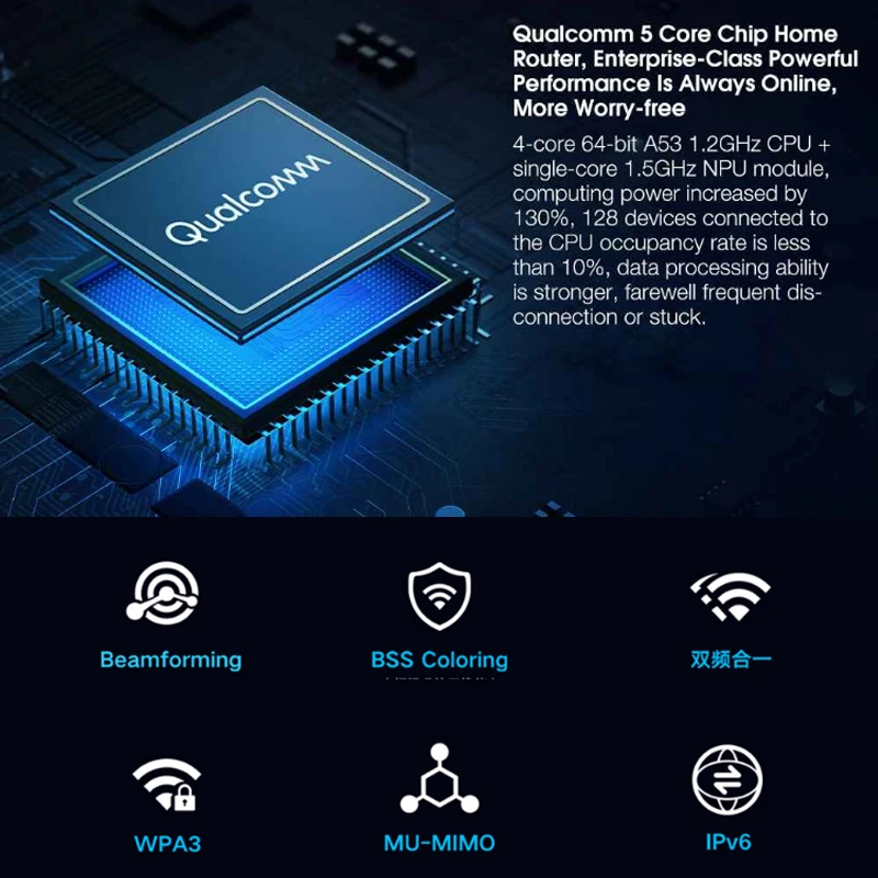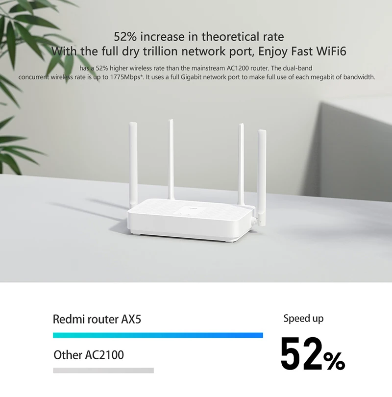 Примечание: Продукт является китайской версией. Адаптер является китайской стандартной версией. Мы предоставим вам вилку, но поскольку адаптер и вилка не подходят для вашей страны/региона, мы не несем ответственности за любые споры или возмещение.Характеристики:Устройство, док-станция Qualcomm 5-основной чип/4 независимых усилители/Быстрый Wi-Fi 6/Поддержка сеточная сеть Описание: Название продукта: роутер Redmi AX5Процессор: IPQ6000 4-х ядерный A53 1,2 ГГц ПроцессорСеть ускорение двигателя: одноядерный 1,5 ГГц NPU.ROM: 128 МбПамять: 256 Мб2,4G Wi-Fi: 2X2 (поддерживает протокол IEEE 802.11ax до теоретической максимальной скорости 574 Мбит/с)5G Wi-Fi: 2X2 (максимальная поддержка протокола IEEE 802.11ax, теоретическая максимальная скорость до 1 201 Мбит/с)Антенна продукта: 4 внешних антенныОхлаждение продукта: Естественное охлаждениеИнтерфейс машины:1 10/1 00/1000 м адаптивный порт WAN (Авто MDIMDIX)Для детей возрастом от 3 до 10/100/1000 м адаптивный портов LAN (Auto MDI/MDIX)Светодиодный индикатор: 2 (системный индикатор * 1, Intemet индикатор * 1)Кнопка сброса системы: 1Входной интерфейс питания: 1Стандарт протокола:IEEE 802,1 1a/b/g/n/ac/ax, IEEE 802,3/3u/3abСтандарты сертификации:ГБ/T9254-2008; GB4943.1 -2011Упаковочный листAX5 Маршрутизатор x 1Руководство x 1Кабель питания x 1