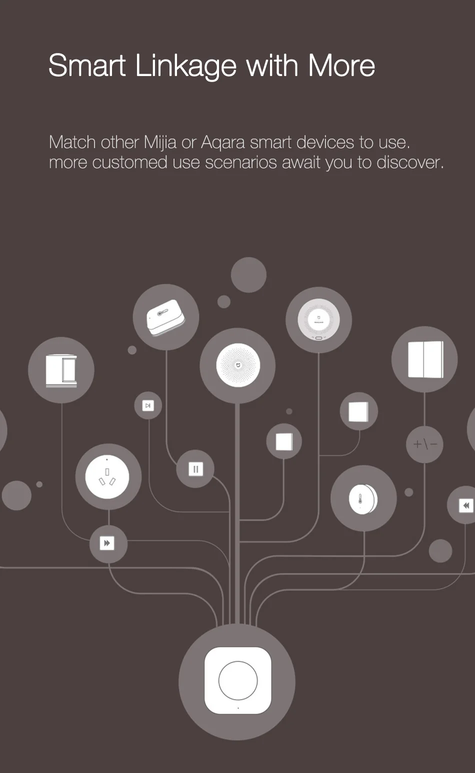 Умный беспроводной переключатель Aqara-это простое и портативное одно кнопочное устройство. Однако он может управлять многими смарт-устройствами Xiaomi. Благодаря беспроводному подключению ZigBee этот умный переключатель может использоваться как дверной звонок, кнопка переключения, пульт дистанционного управления и т. д. через приложение «Mi Home''. Это очень удобно для вас. Более того, клей на обратной стороне и маленький размер позволяют его положить или приклеить в любом месте.