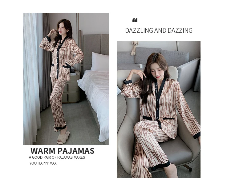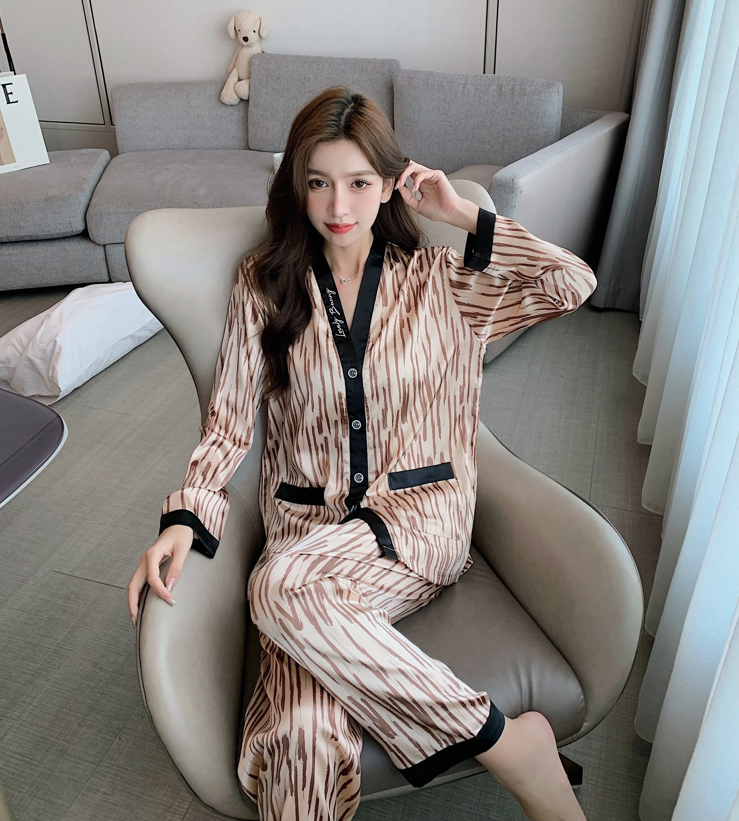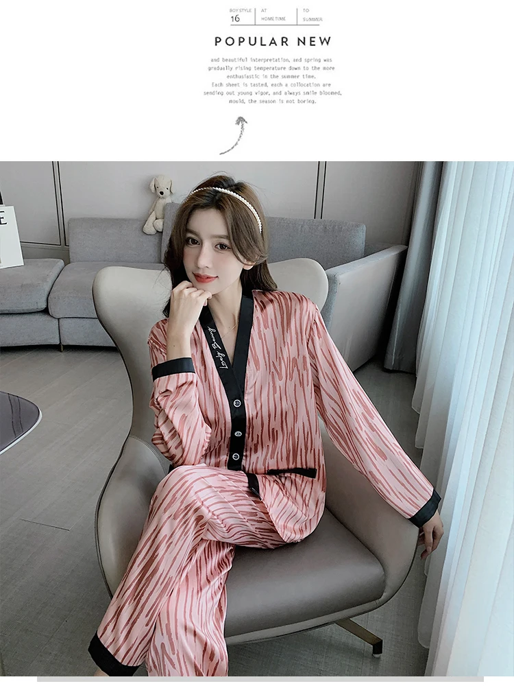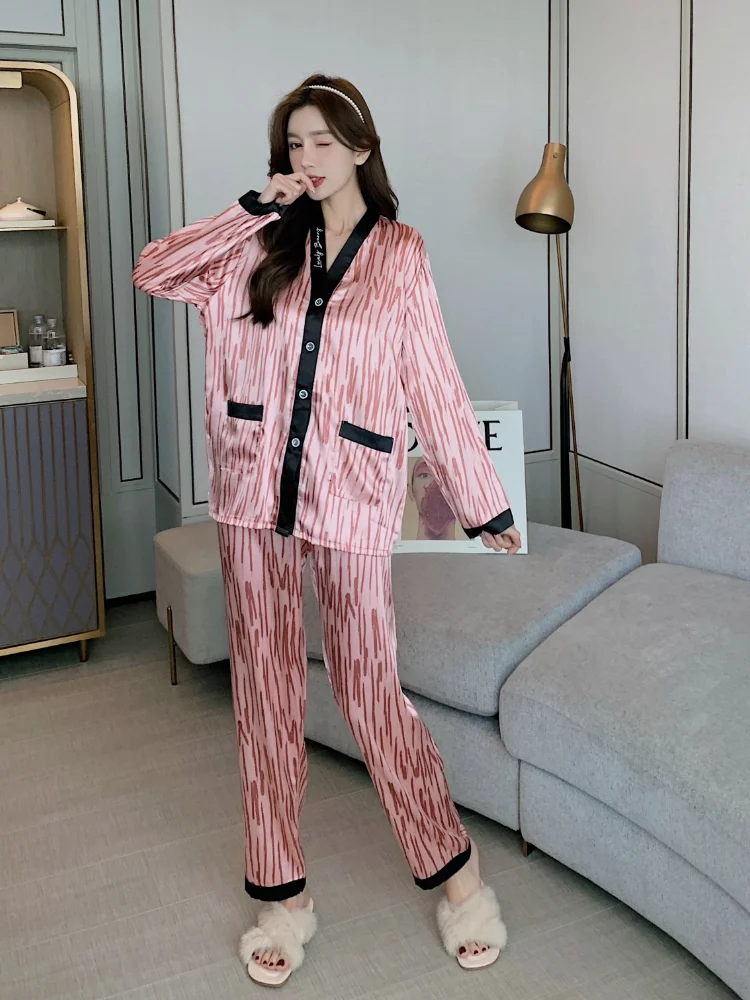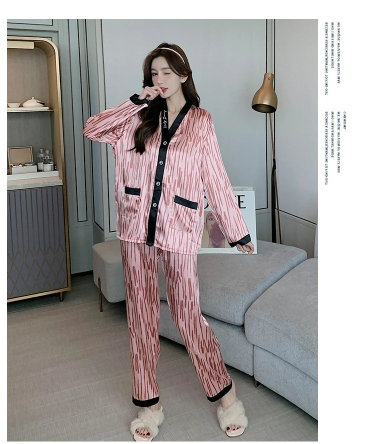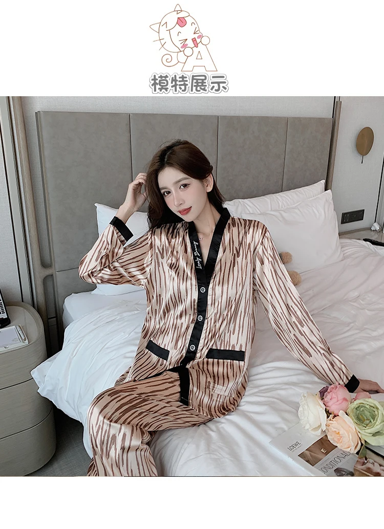 Женский Шелковый Атласный пижамный комплект, брюки с длинным рукавом, мягкая Домашняя одежда, одежда для сна с пуговицами и принтом, домашняя одежда, Женский пижамный комплект