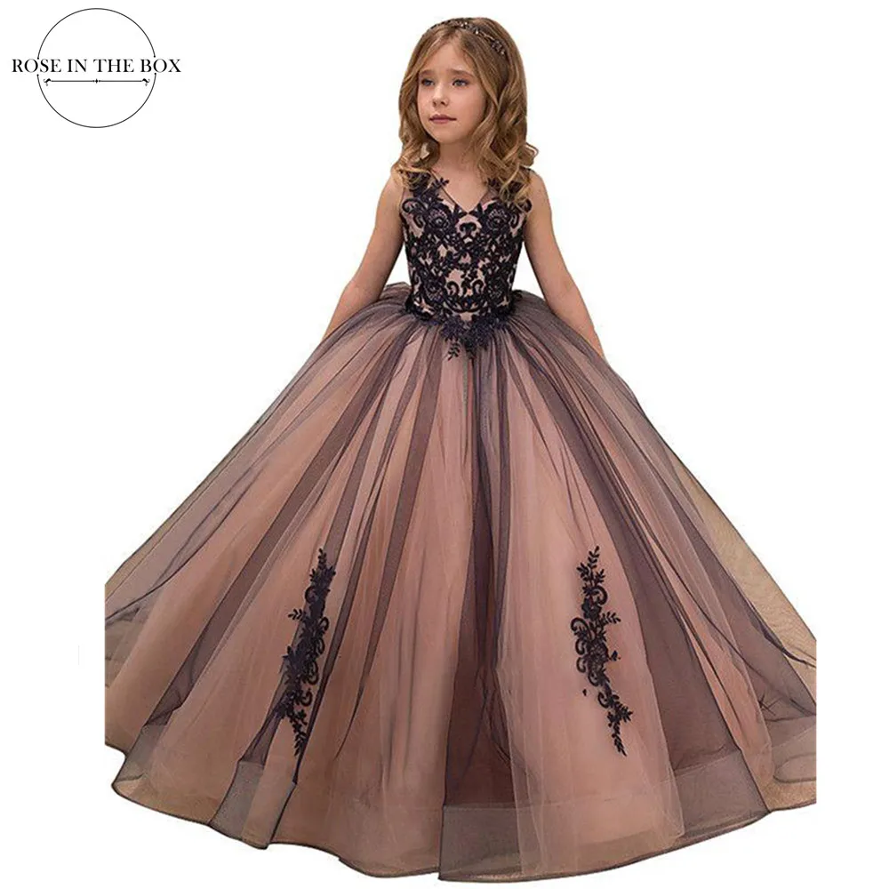 Элегантное Черное Кружевное Тюлевое платье с цветами для девочек 2022, бальное платье принцессы с V-образным вырезом и пуговицами сзади, платье принцессы, детское платье принцессы для девочек