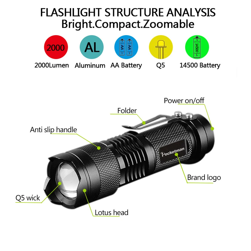 Об этом материале:Супер яркий Q5 светодиодный 300 люмен ручной ТактическийРастяните его, чтобы отрегулировать фокус широкого прожектора или прожектораЧехол из алюминиевого сплава, нескользящий дизайн и водонепроницаемый дизайнМощность питания: 1x14500 3,7 в батарея/1 батарея типа AA (не прилагаются)Мини-фонарик помещается в ладони и может переноситься с помощью металлического зажима