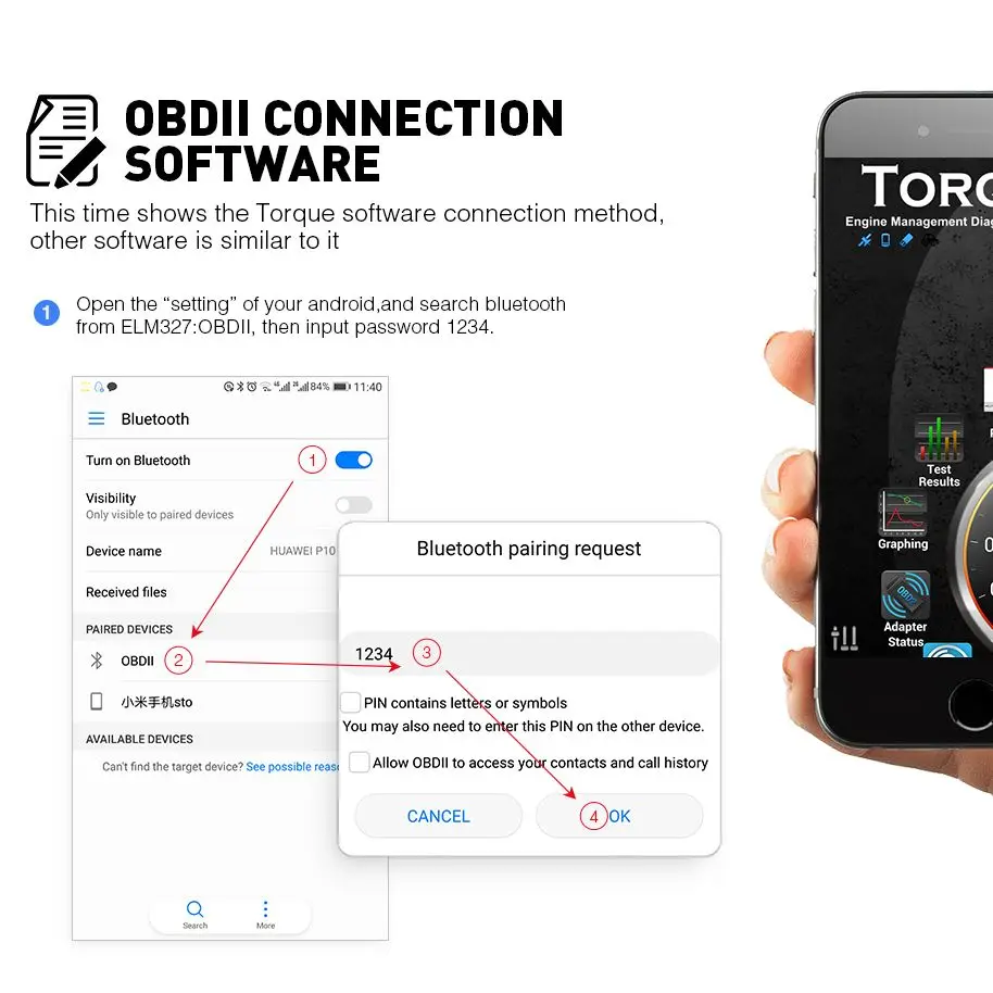 На телефоне Android1. Откройте «Настройки» на вашем Android устройстве и выполните поиск по Bluetooth для «ELM327:OBDll».2. Введите пароль 1234.3. Откройте приложение Torque, перейдите в настройки, настройки Адаптера OBD2, тип подключения, Bluetooth, назад, затем выберите5. Bluetooth-устройство, OBDII[AA:BB:CC:11:22:33].6. Затем вы можете просмотреть и изменить настройки и Параметры транспортного средства.
