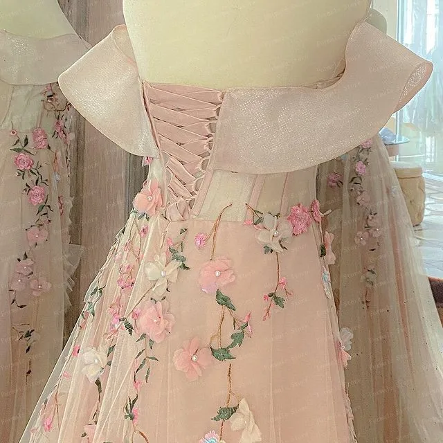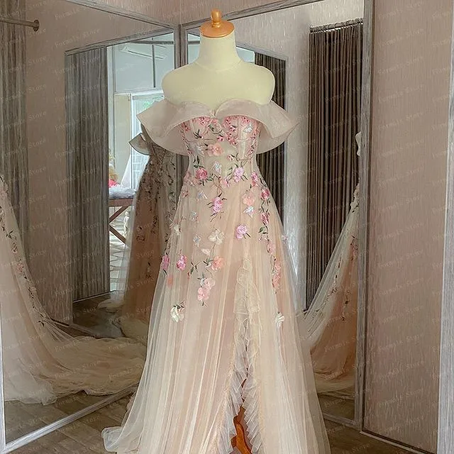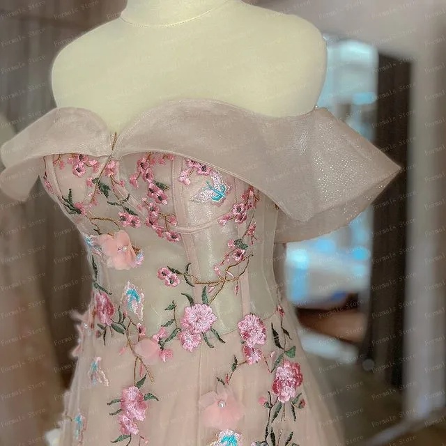 Платье-трапеция с открытыми плечами, Цветочное платье, светло-розовое асимметричное платье для выпускного вечера с длинным шлейфом, женские вечерние платья, платья с аппликацией