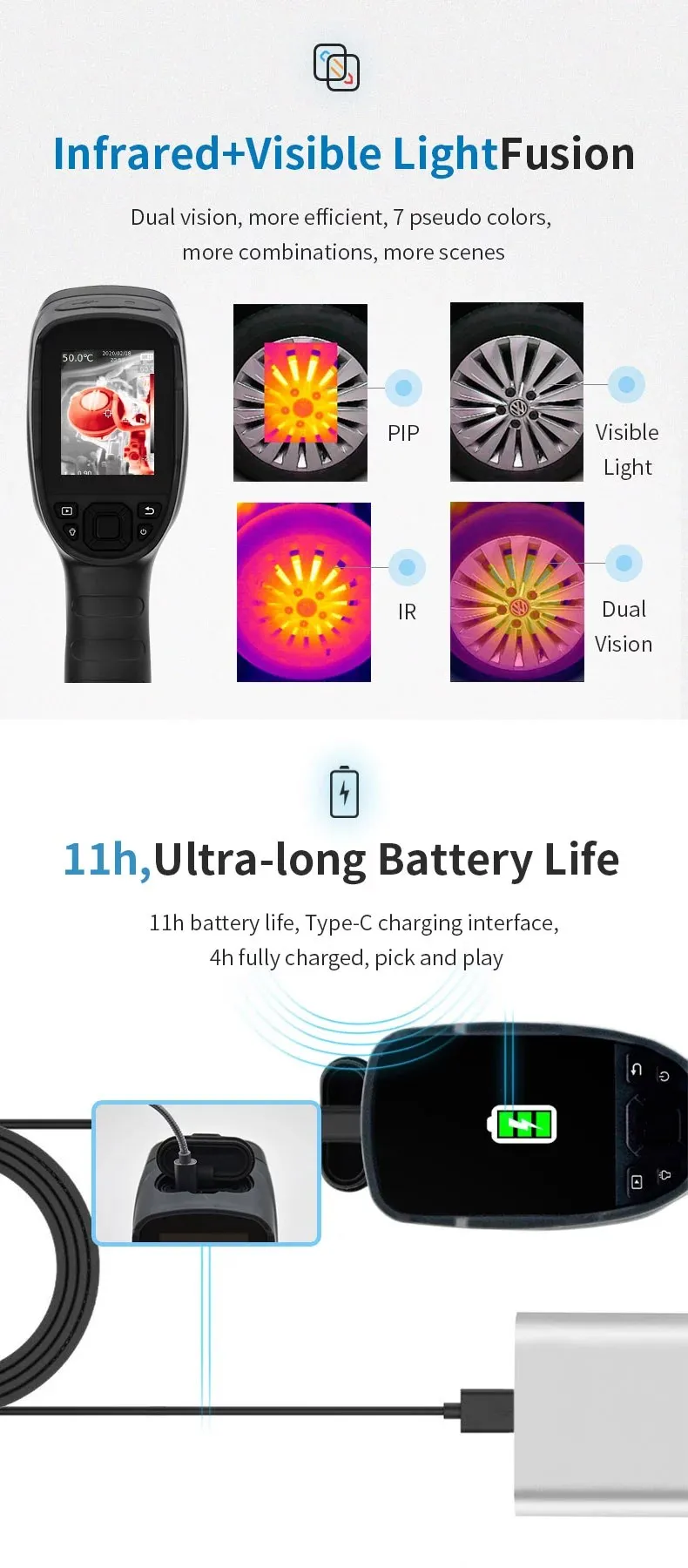 Режим изображения: Тепловое изображение, fusion, PIP (изображение на фото), цифровая камера (визуальный светильник)