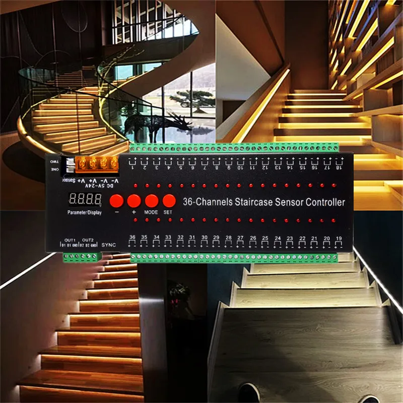 36 канальная Многофункциональный светодиодный лестница контроллер с двумя датчики, который может управлять 2 виды светодиодный полоски, одна полоса, которая поддерживает Однолинейный чип через SPI, например, общего назначения 1903, 1812, 16703 WS2811 и других полноцветных пикселей светодиодный свет, система управления находится в левом нижнем углу D01, GND, DO2 и GND имеют два параллельных выхода клеммы, которые могут быть подключены к левой и правой сторонах лестничного светильник. Выходные клеммы с обеих сторон контроллера-36 монохроматических лент-светильник, количество полос-светильник регулируется, Функция настройки сенсорного контроллера выбирается кнопкой, И установки показана left 4-разрядный цифровой светодиодной лампой.