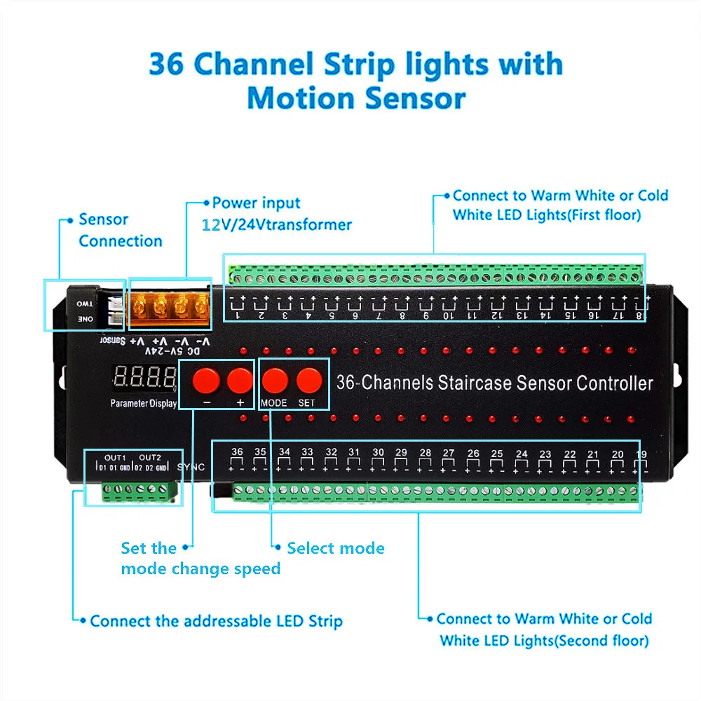 1. Контроллер имеет два интерфейса устройства для обнаружения человека, которые отмечены сенсорным подключением в верхней левой части изображения.2. Правая сторона маркированного сенсорного соединения находится там, где продукт подключен к источнику питания. Он имеет два источника питания с положительными полюсами и два источника питания с отрицательными полюсами. При подключении необходимо одновременно подключить любой из положительных и отрицательных полюсов, чтобы устройство было нормально работать.3. Далее расположены порты с арабскими цифрами 1-36. Они относятся к количеству ваших шагов. Если количество шагов составляет всего 10, вам нужно всего лишь подключить 10 портов 1-10. Просто Отрегулируйте данные устройства (Там будут инструкции по регулировке ниже). Если у вас есть 15 шагов, подключите светильник к области 1-15. По аналогии, если есть 36, вы можете идеально подключиться к портам 1-36. Если у вас более 36 шагов. Вам нужно купить второе устройство, чтобы завершить ремонт. На рисунке изображен теплый белый или холодный белый светодиодный светильник s (первый этаж) и подключение к теплому белому или холодному белому Led светильник s (второй этаж) это позиции, в которых светильник соединен с монохромными лестницами.4. Светильник, подключенный к месту, отмеченному «Подключите адресуемую светодиодную ленту»,-это водяной светильник на стене лестницы. Он имеет два порта, «OUT1» и «OUT2» соответственно имеют 3 порта подключения, и «DO» подключен к сигнальной линии pixel dot. «GND» подключается к отрицательному проводу одной розетки сигнального провода. В общей сложности два порта можно подключить к 12V 2811 светильник-бар с пиксельной точкой 40 метров (100 пикселей на 5 метров светильник-бар). Два порта могут быть подключены к общей сложности 800 пикселей. Вы можете подключить светильник бар в соответствии с количеством пикселей вашего светильник бар.5. Четыре красные кнопки на устройстве, "-" "+" "режим" набор ". Они предназначены для регулировки количества шагов, контролируемых оборудованием, светильник и скорость тушения планки светильник, выбор цвета бар светильник на стороне лестницы, длина и скорость струящейся воды. Эти четыре кнопки должны сотрудничать для завершения.