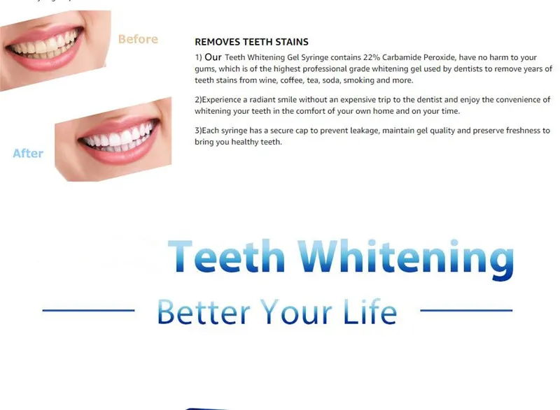Улыбка без пятен: Отбеливание зубов Гели могут быстро и безопасно удалить все сигареты, кофе и чай пятна, которые были образованы в течение многих лет, и помочь вам найти отбеливание улыбки легко.