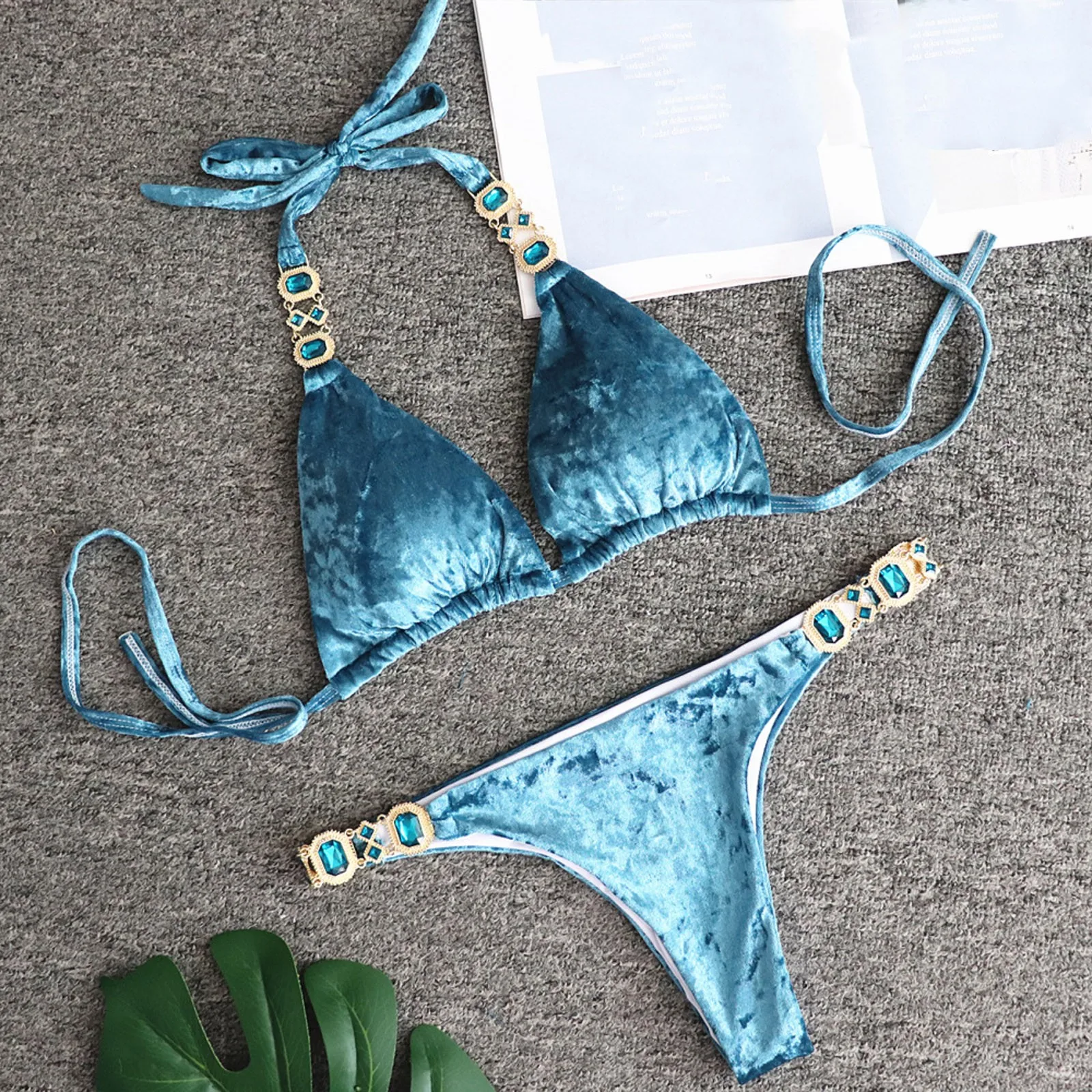 Новый Модный женский сексуальный однотонный Бархатный комплект бикини со стразами на бретельках женский раздельный купальник Сексуальная Пляжная одежда со стразами аксессуары